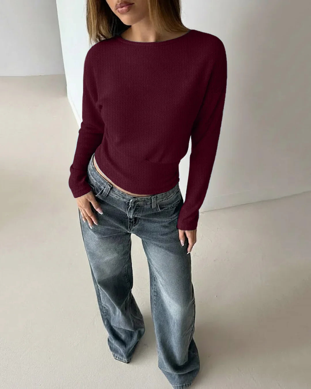 Round Neck Waist-Cinched Slim Fit Straight Hem Solid Long Sleeve Top in Maroon