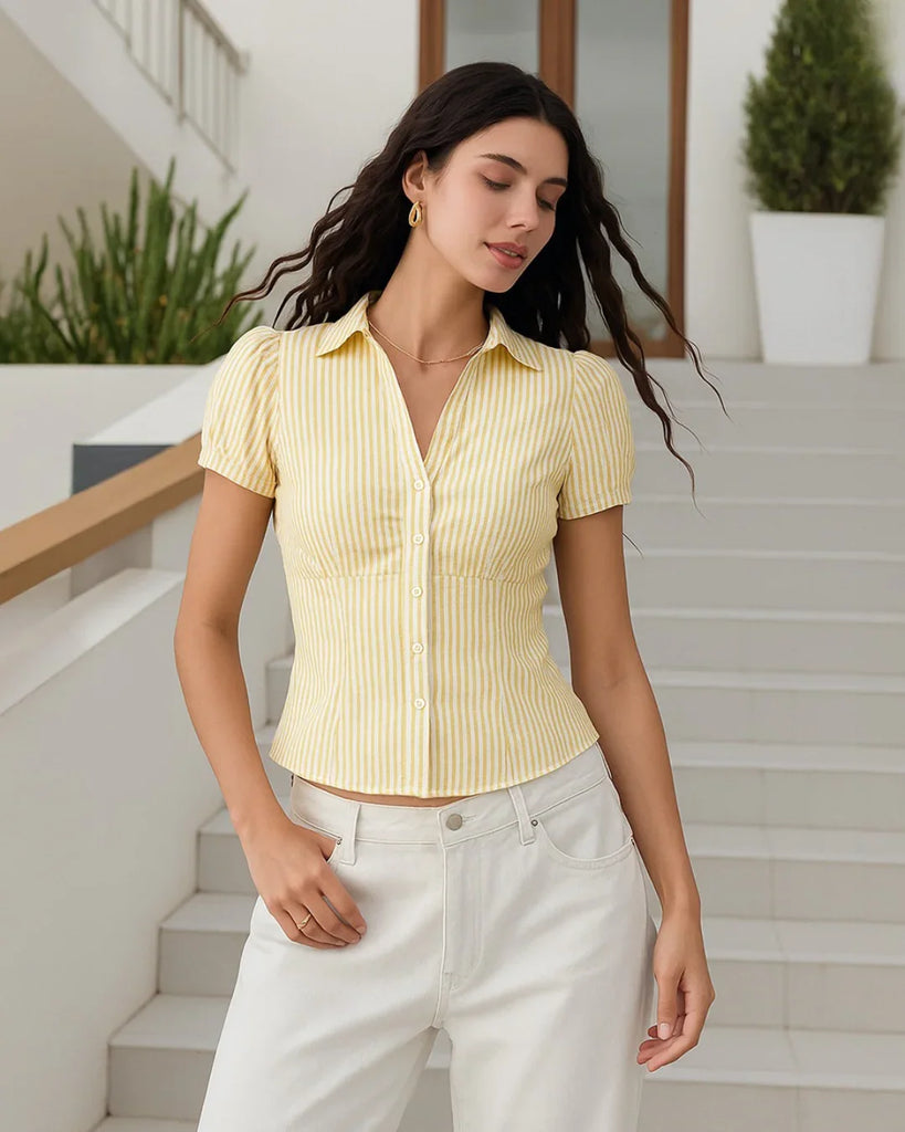 Ruched Button Down Puff Sleeve Top in Yellow is a bright and playful piece that adds charm to any outfit. Featuring a collared neckline, button-down front, and gathered detailing at the waist, this puff sleeve top blends classic tailoring with a fun, feminine vibe. The soft yellow stripes make it a standout for both casual and chic outings.