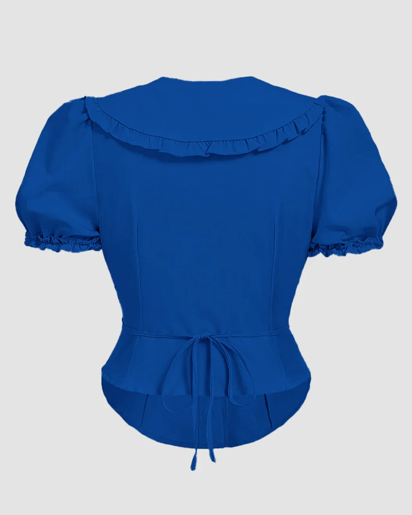 Bring vintage-inspired charm to your wardrobe with this puff sleeve blouse in a striking surf blue shade. Featuring a ruffled Peter Pan collar and soft puffed sleeves, it balances elegance with a playful edge. Perfect for both casual outings and polished occasions, this puff sleeve blouse is designed to stand out effortlessly.