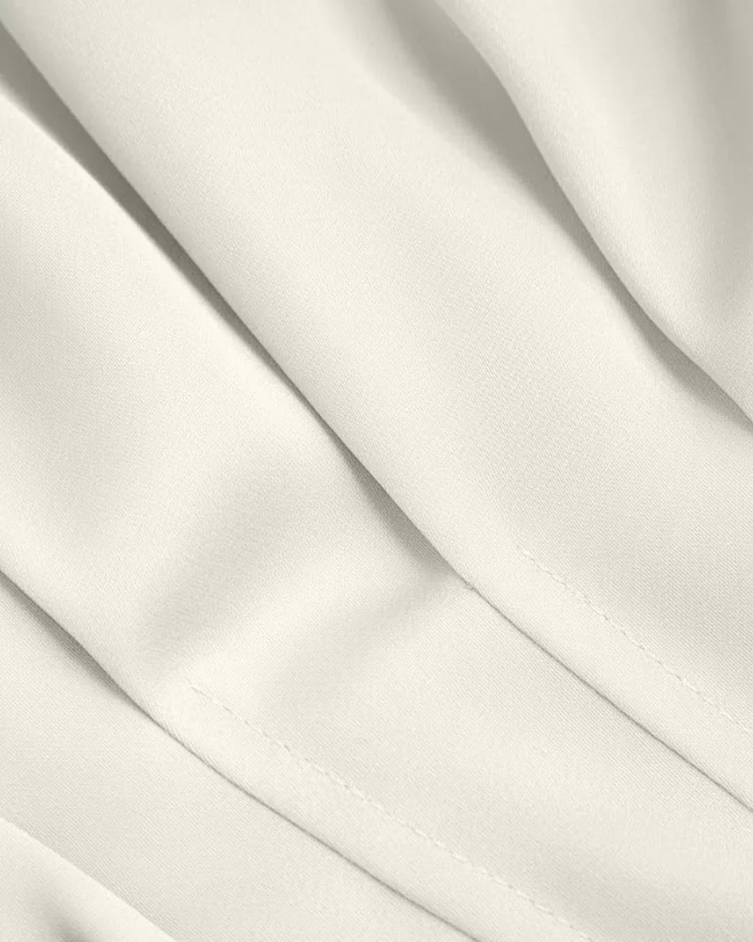This short sleeve shirt in Off White blend’s feminine structure with timeless polish. Designed with a soft satin sheen, it features a collared neckline, front button closure, and pleated cinching that contours the waist beautifully. The relaxed sleeves balance the fitted midsection, giving this short sleeve shirt in Off White a fluid yet tailored silhouette that’s flattering on all body types.