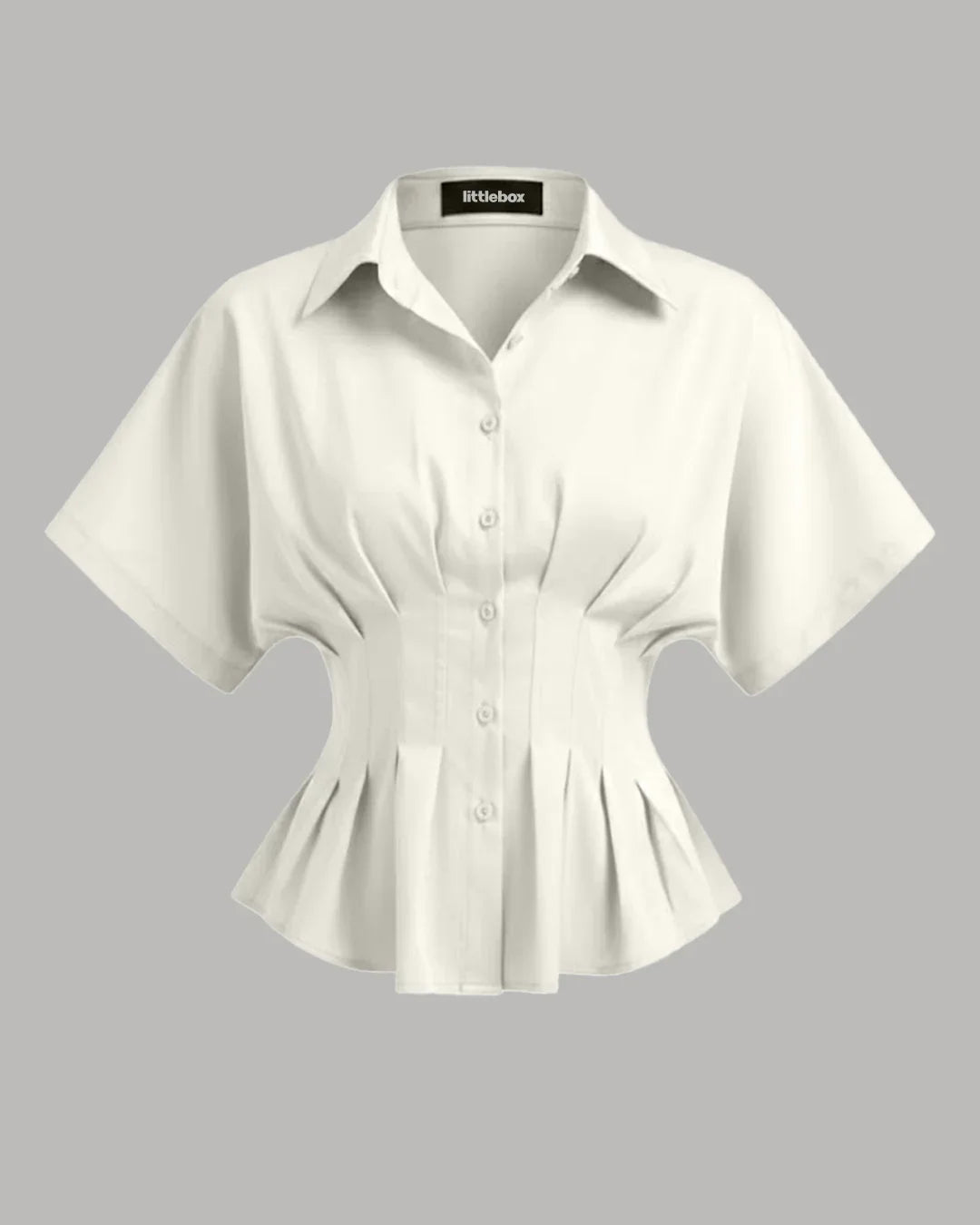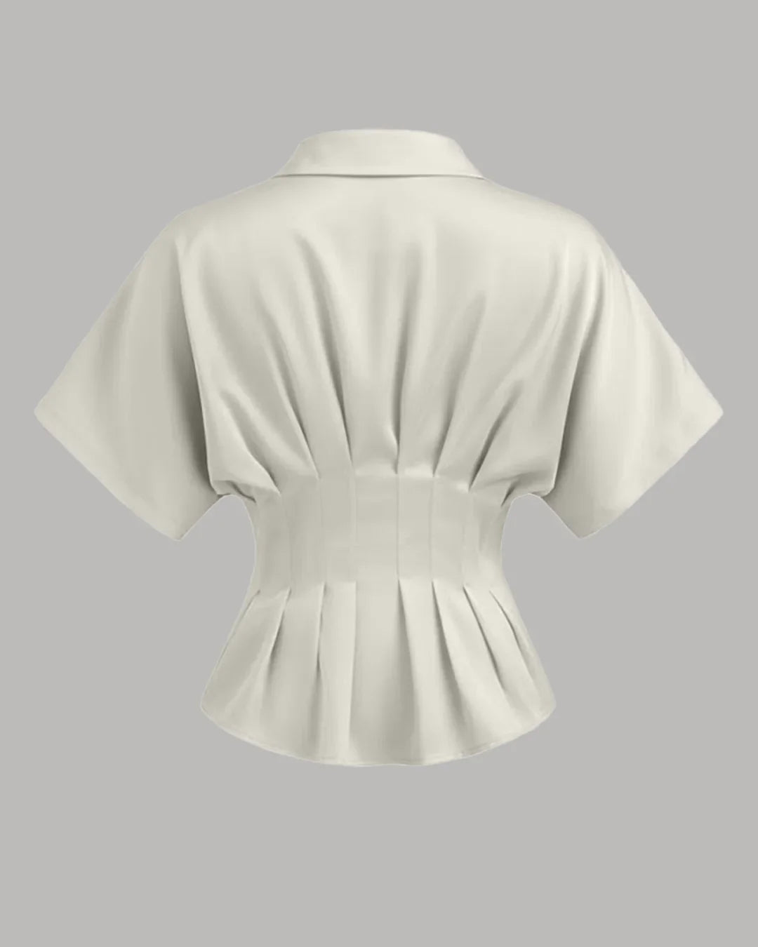 Satin Collar Pleated Cinched Short Sleeve Shirt in Off White