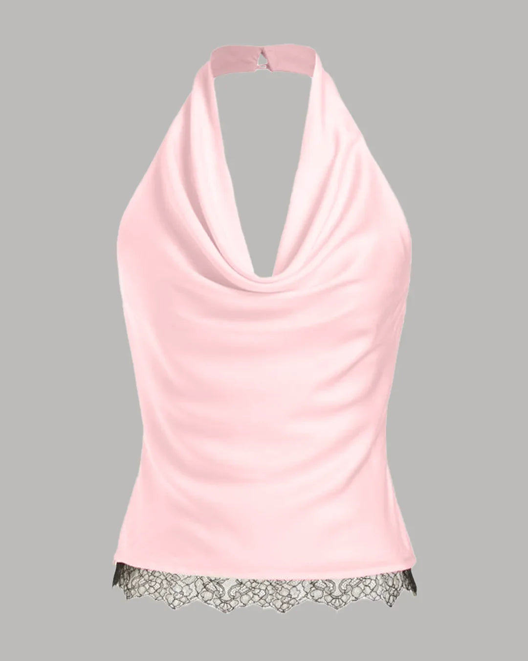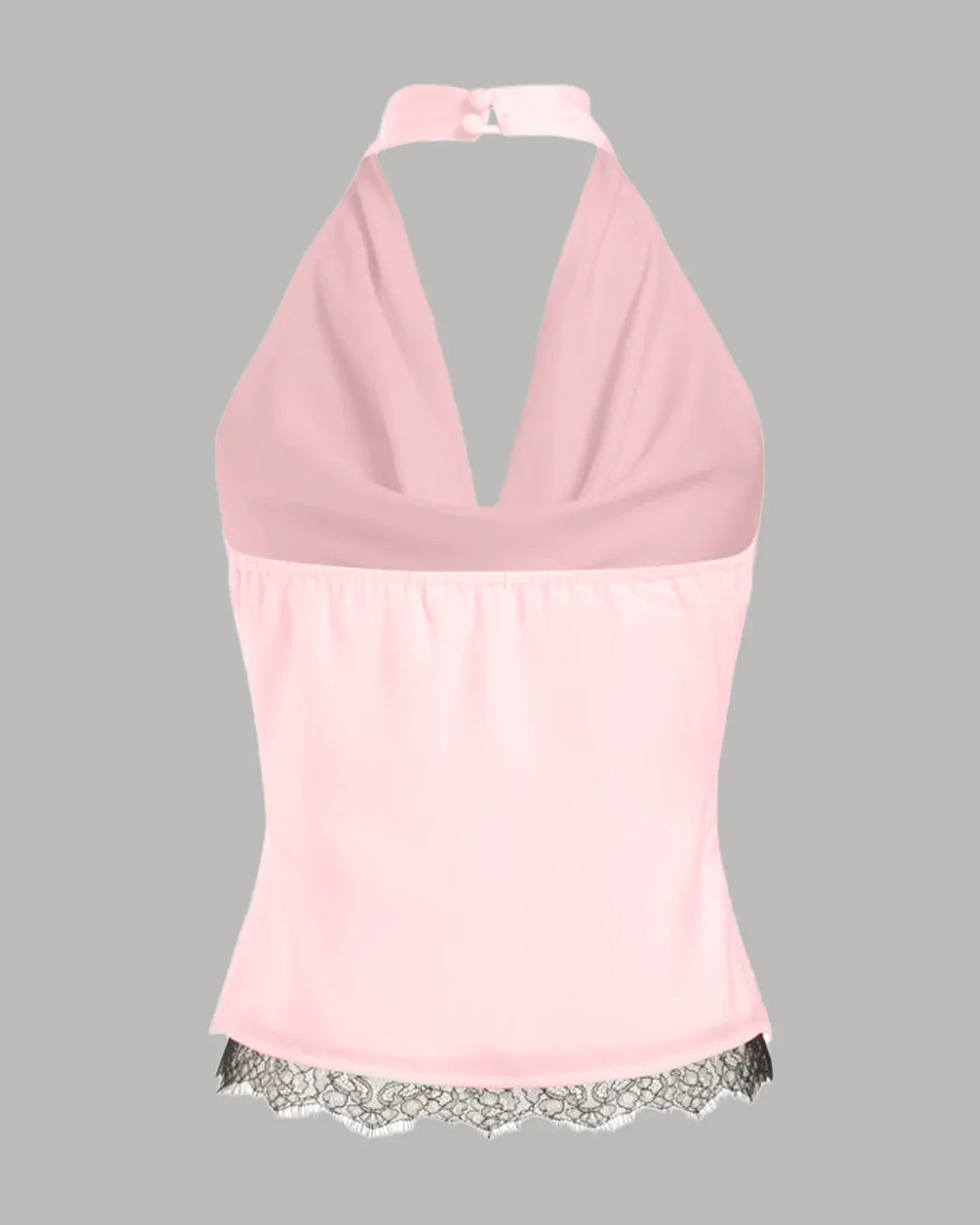 Satin Halter Neck Lace Trim Ruched Top in Cherry Blossom