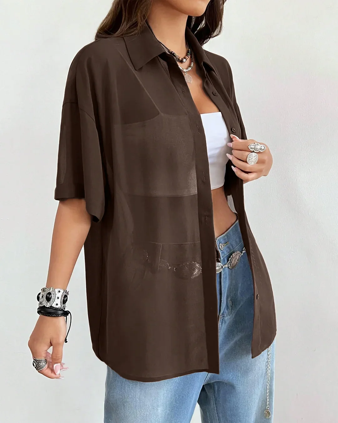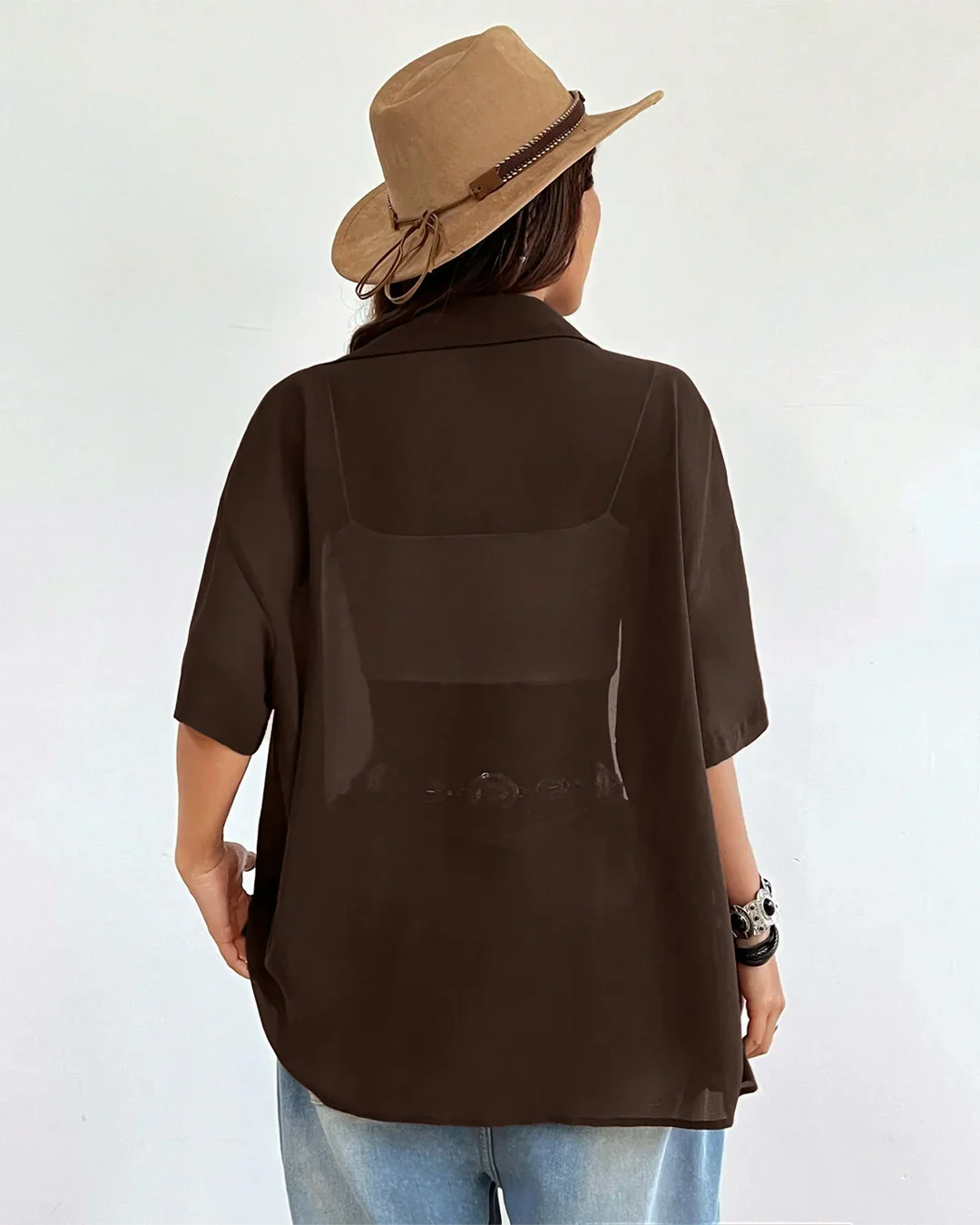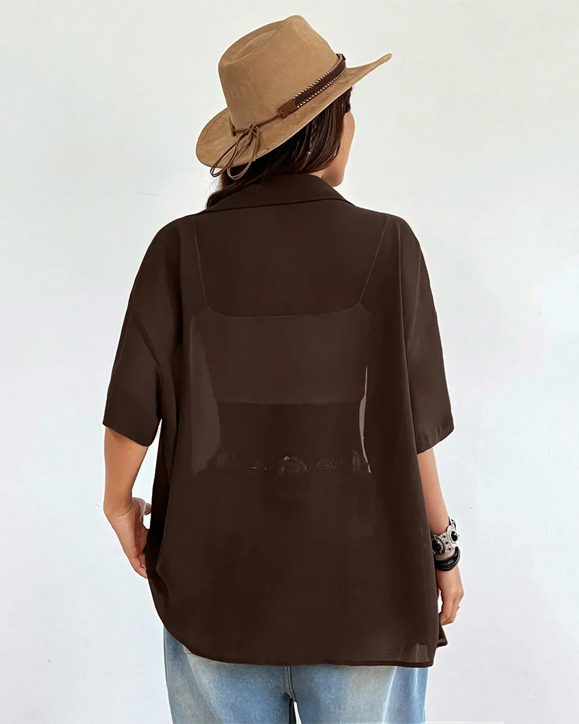 Stay laid-back and stylish with this oversized shirt in a rich coffee shade. Its relaxed button-down design and sheer fabric make it the perfect layering piece over bralettes, crop tops, or tanks. Easy to throw on and effortlessly chic, this oversized shirt is your go-to for casual cool looks.