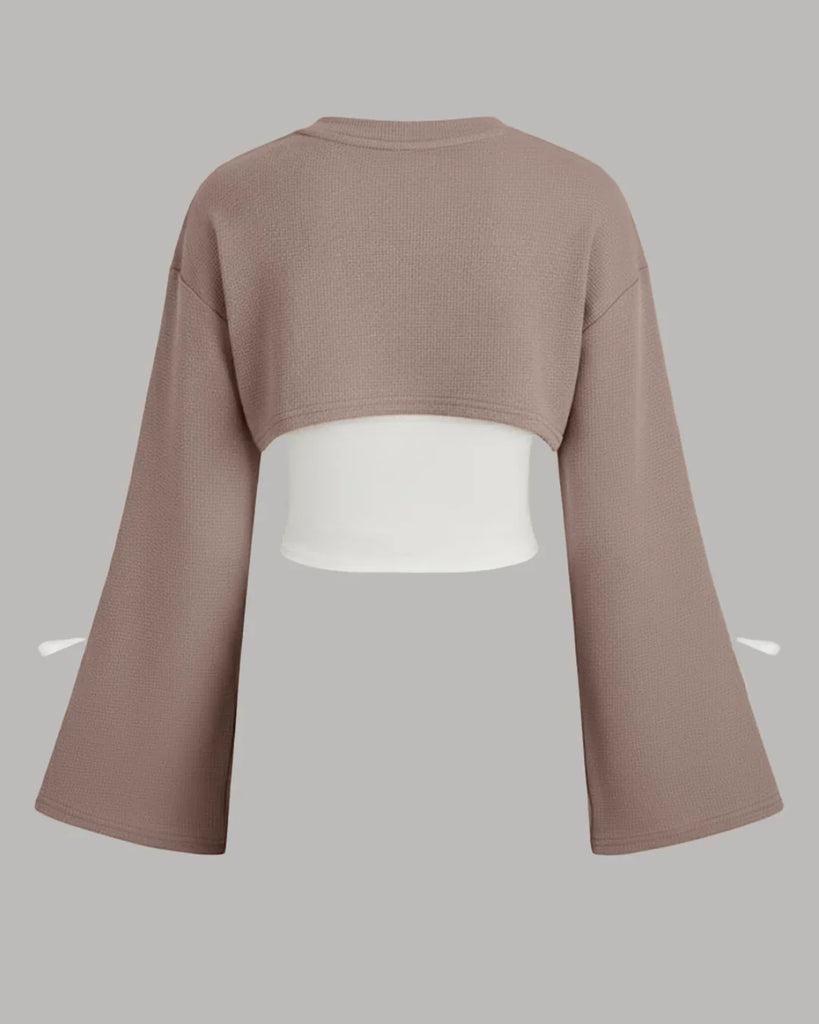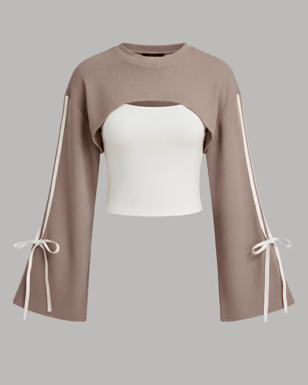 Side Striped Bowknot Sweatshirt & Solid Cropped Cami Top In Camel And White