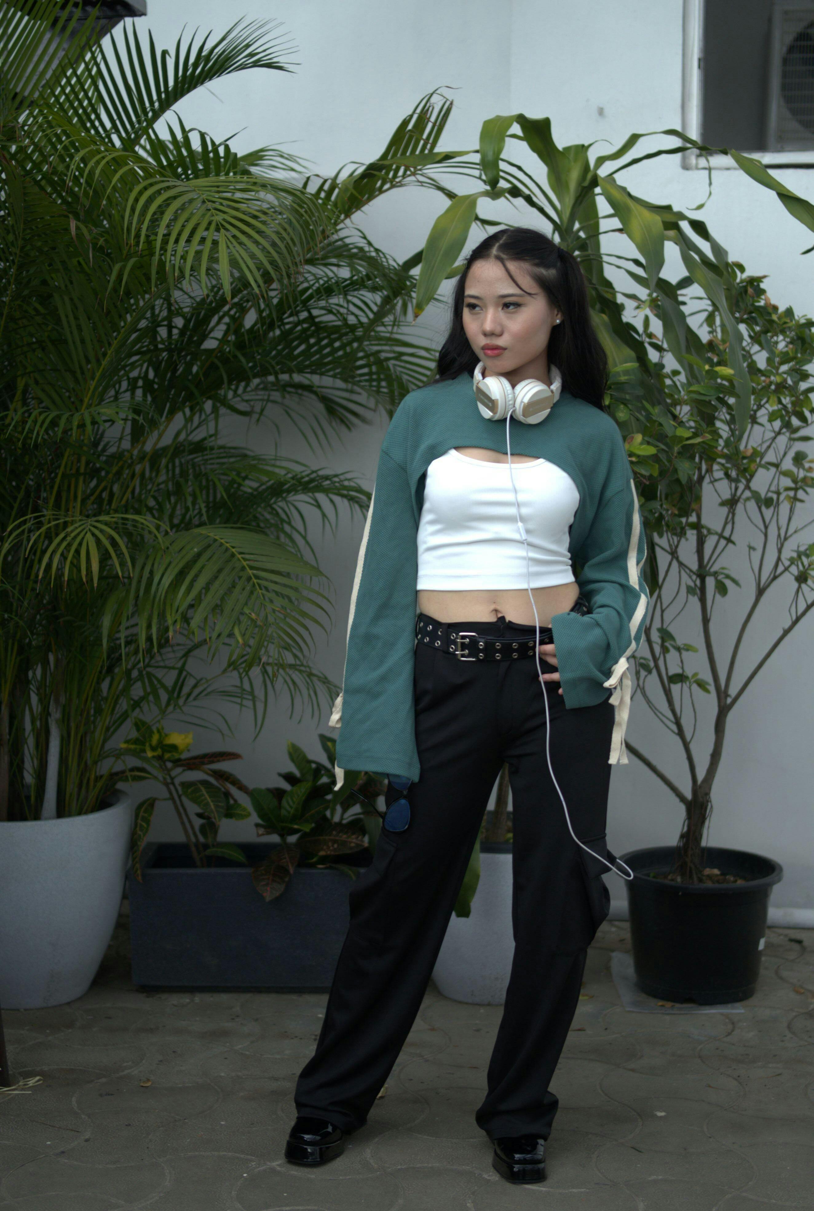 Introducing our Side Striped Bowknot Sweatshirt & Solid Cropped Cami Top in Green and Rib White. This two-piece stunner includes a soft green sweatshirt with flared sleeves and bow-tie details, layered over a snug white solid cami top. It's all about creative layering with minimal effort.