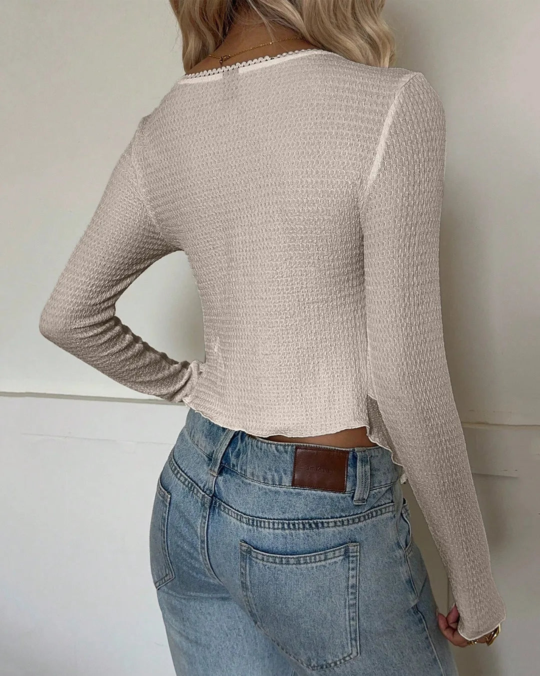 The deep neckline gives it a confident edge, balanced perfectly by the fitted long sleeves. It’s the kind of piece that works for both day and night styling without trying too hard.