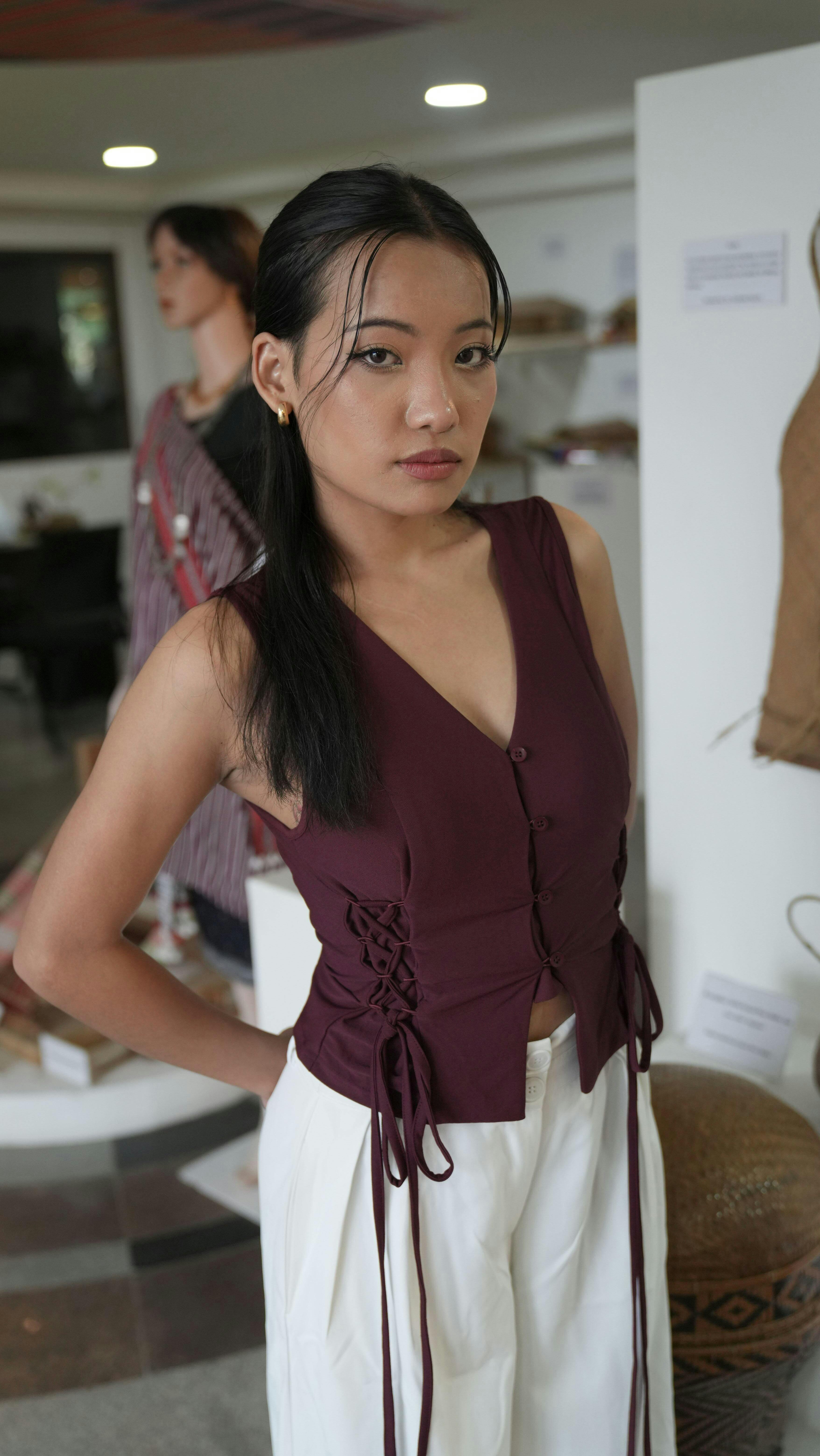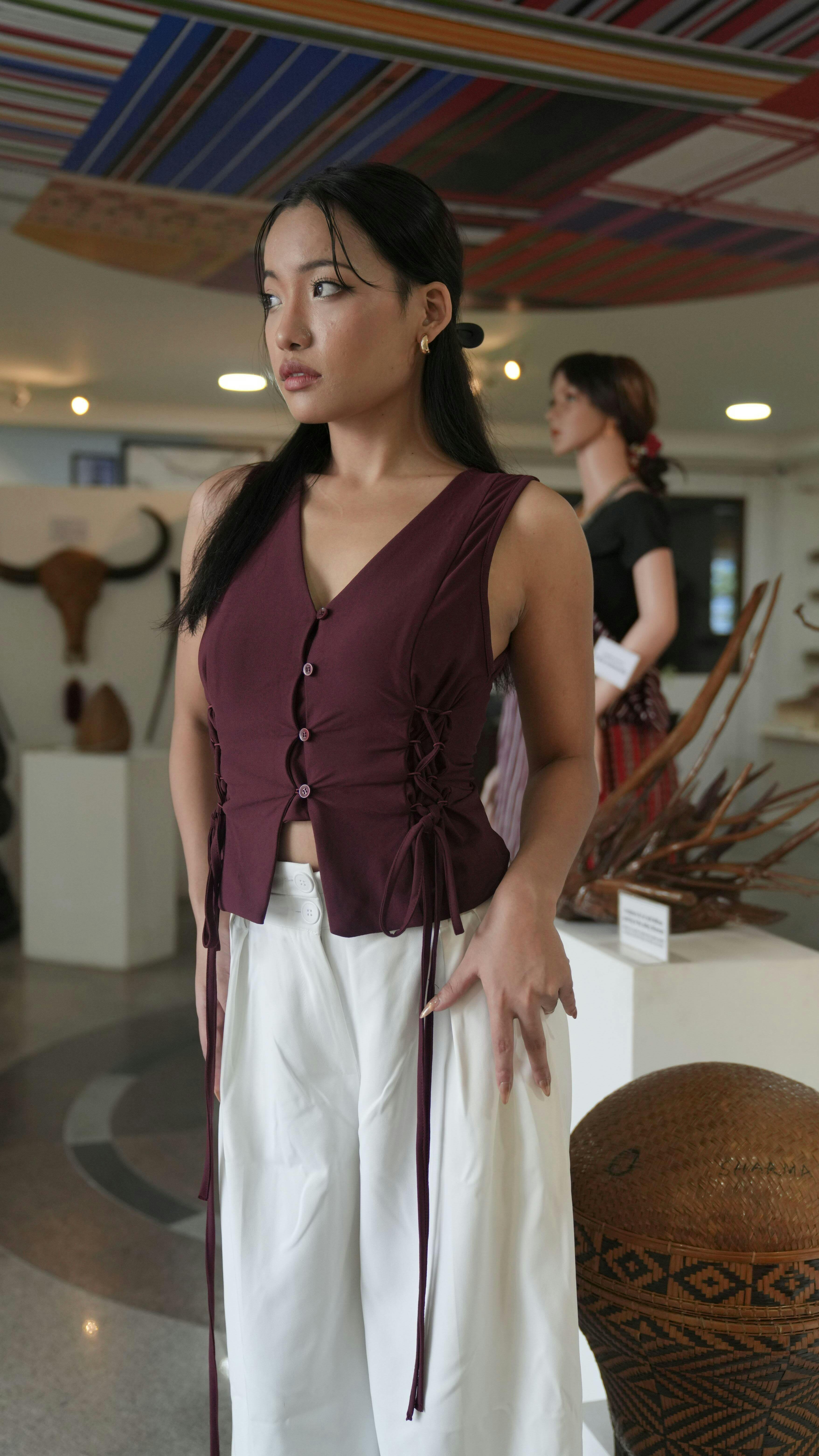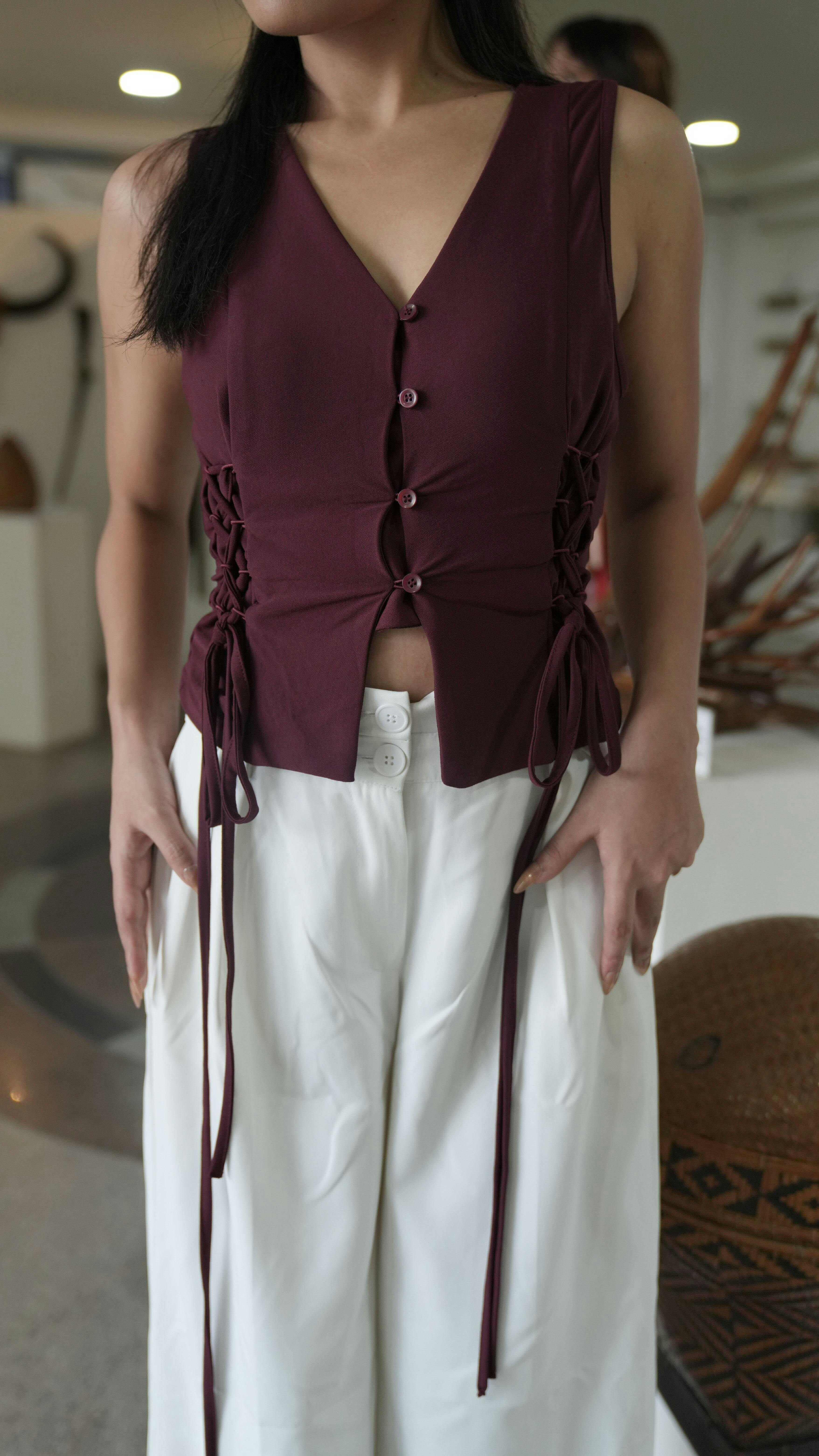 Introducing our Solid Color Cross Tie Strap Black Side Strap Crop Tank Top In Maroon. This crop tank top serves major structure and sass with its lace-up side detailing and contoured fit. Designed in a rich maroon shade, it blends edgy energy with soft tailoring, making it a standout for everything from streetwear looks to evening drama.