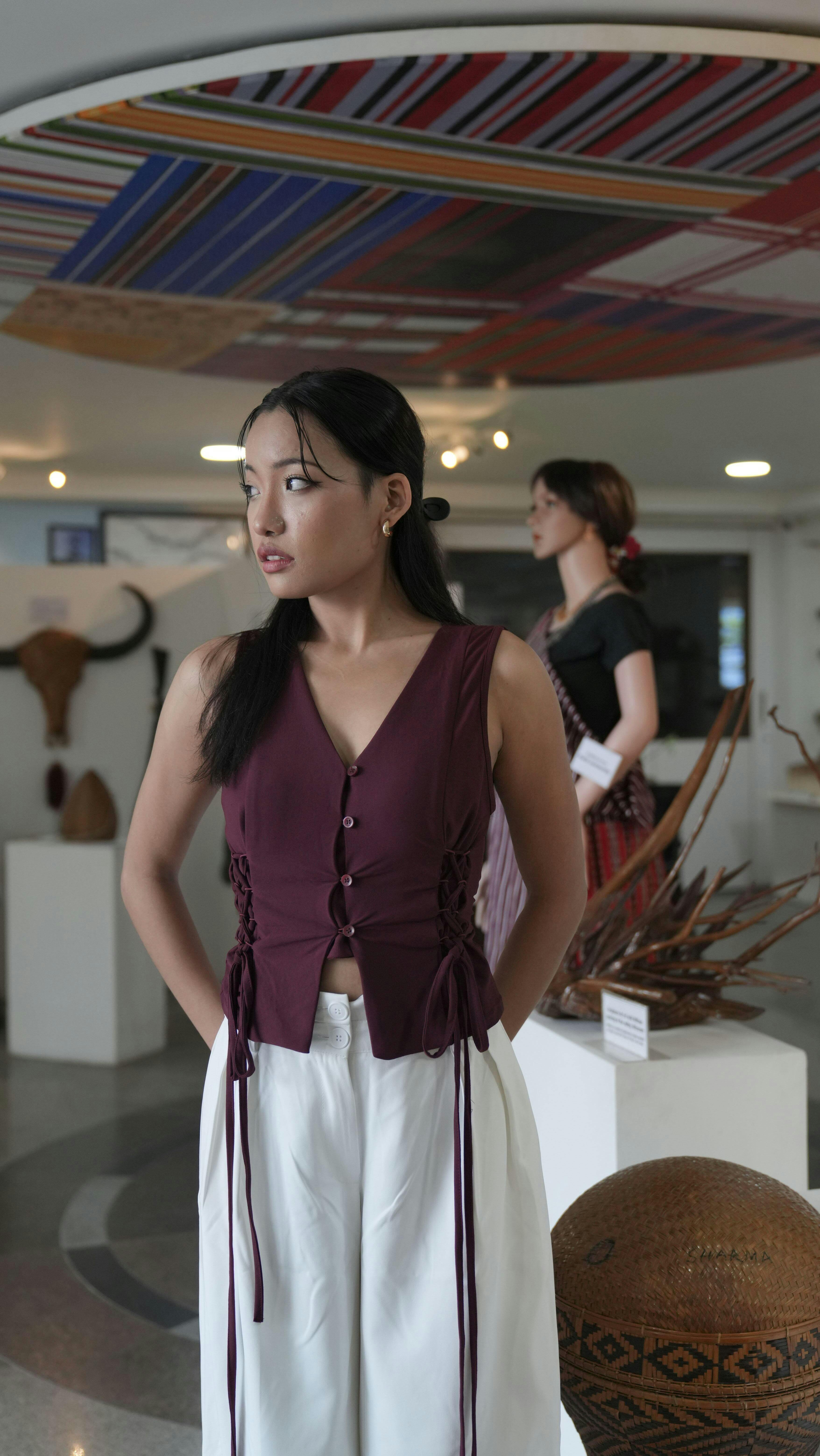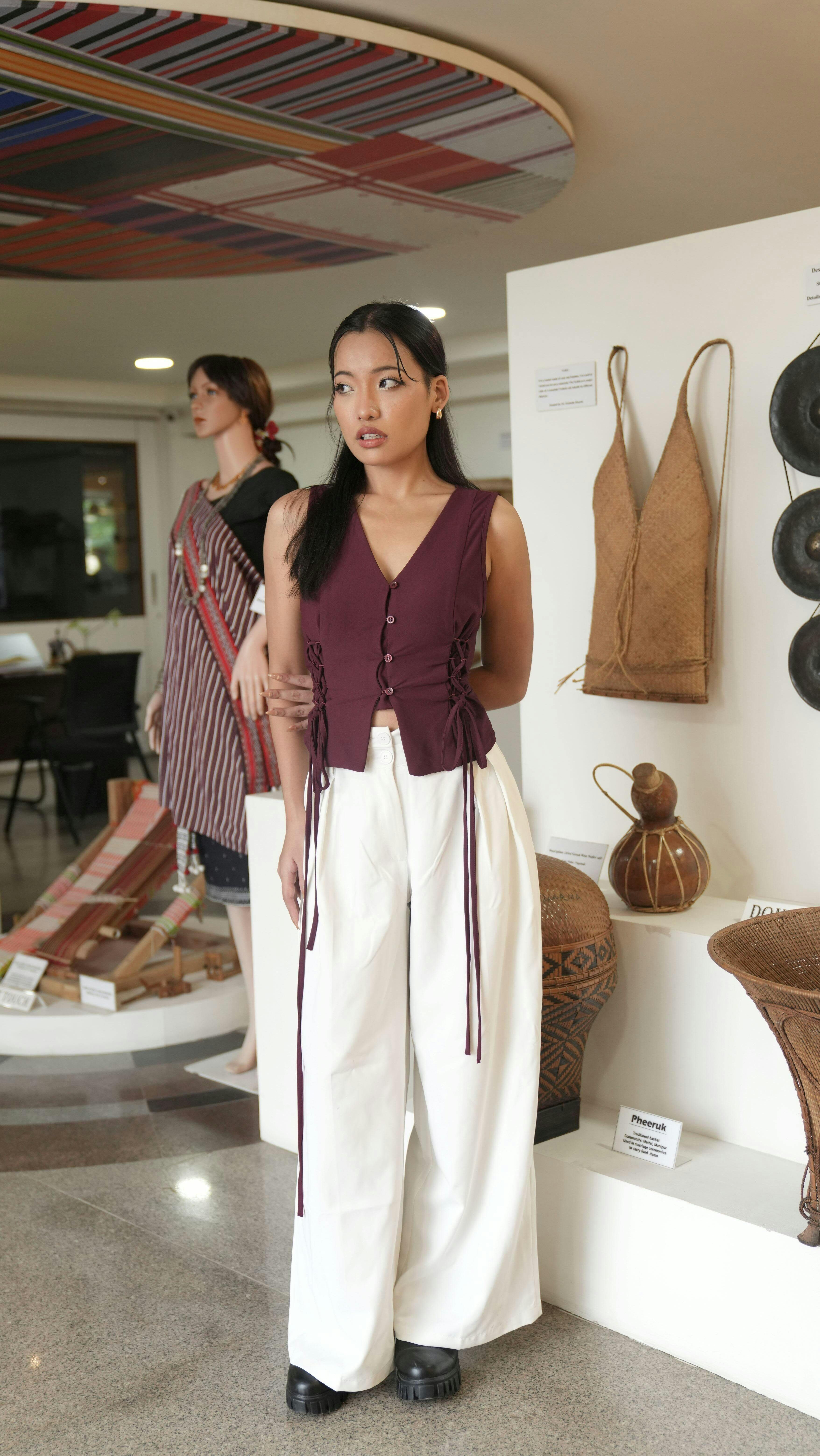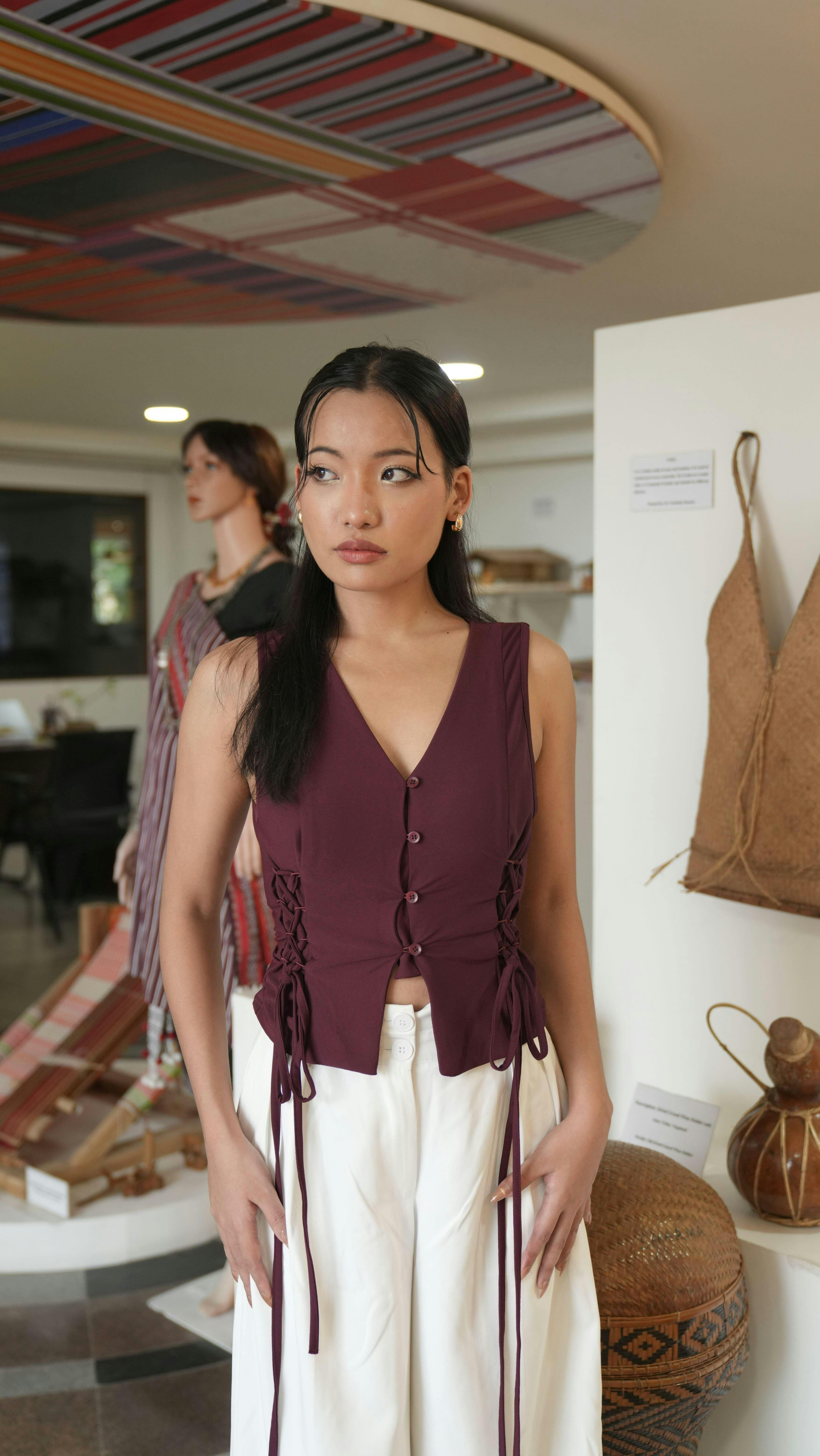 Introducing our Solid Color Cross Tie Strap Black Side Strap Crop Tank Top In Maroon. This crop tank top serves major structure and sass with its lace-up side detailing and contoured fit. Designed in a rich maroon shade, it blends edgy energy with soft tailoring, making it a standout for everything from streetwear looks to evening drama.