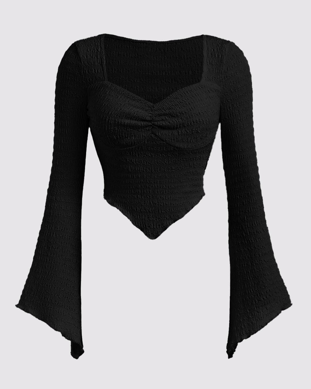 Ribbed Long Sleeve Flared Hem Statement Top in Black