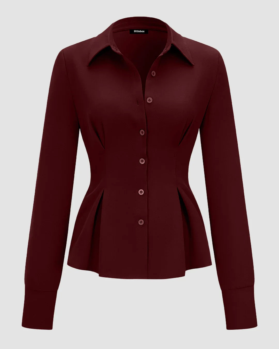 Solid Ruched Button Long-Sleeve Shirt brings a clean, structured vibe with a soft feminine twist. Designed with subtle ruching along the waist, this shirt naturally shapes your silhouette while keeping the look polished and effortless. The collared neckline and button-down front add a classic touch, making it easy to dress up or down. With its smooth finish and tailored fit, the Solid Ruched Button Long-Sleeve Shirt feels modern, minimal, and perfect for everyday styling without feeling too formal.