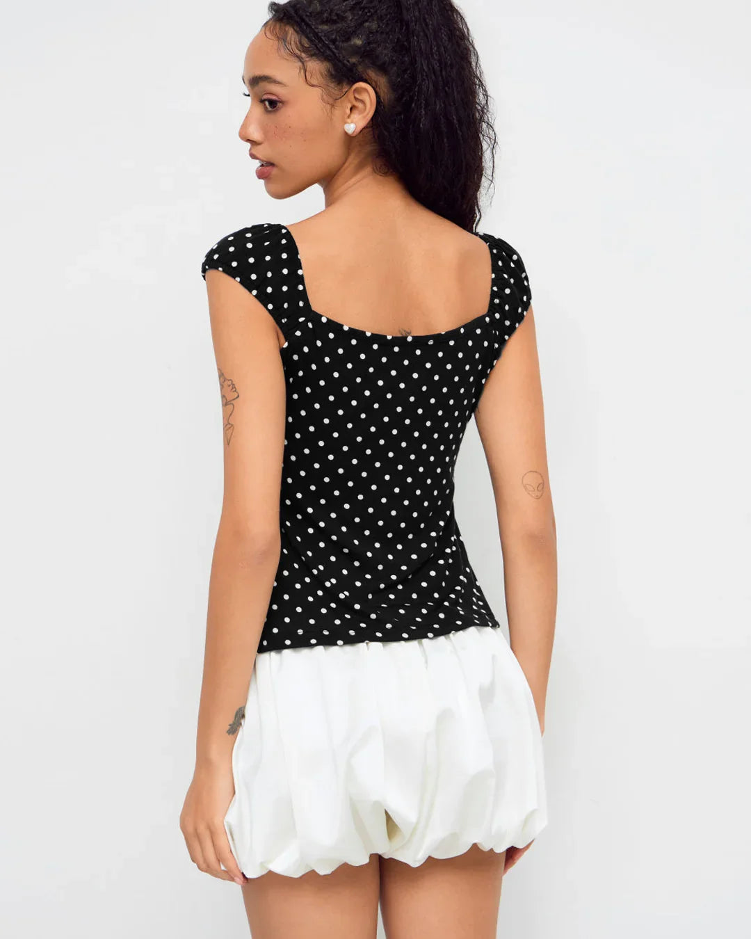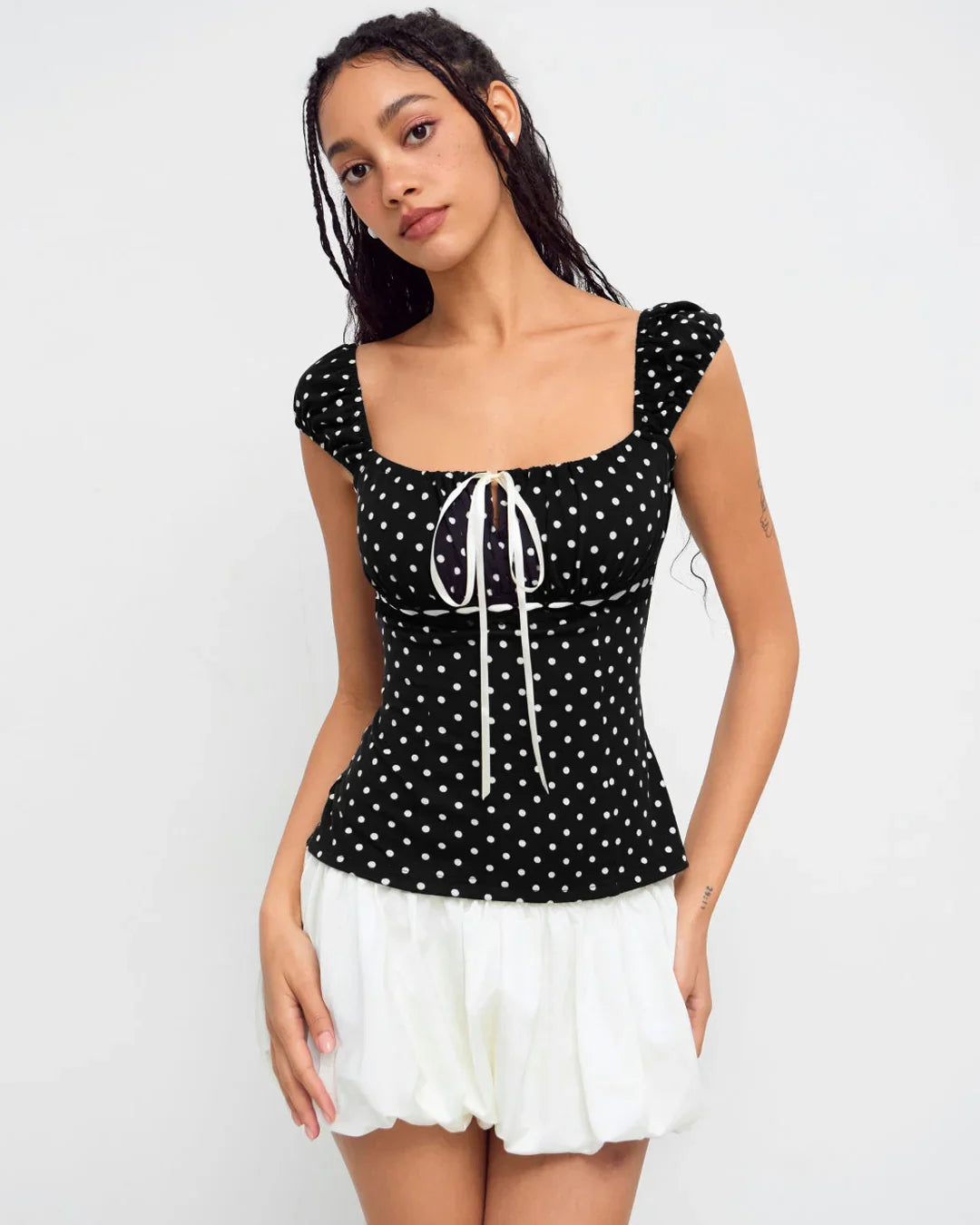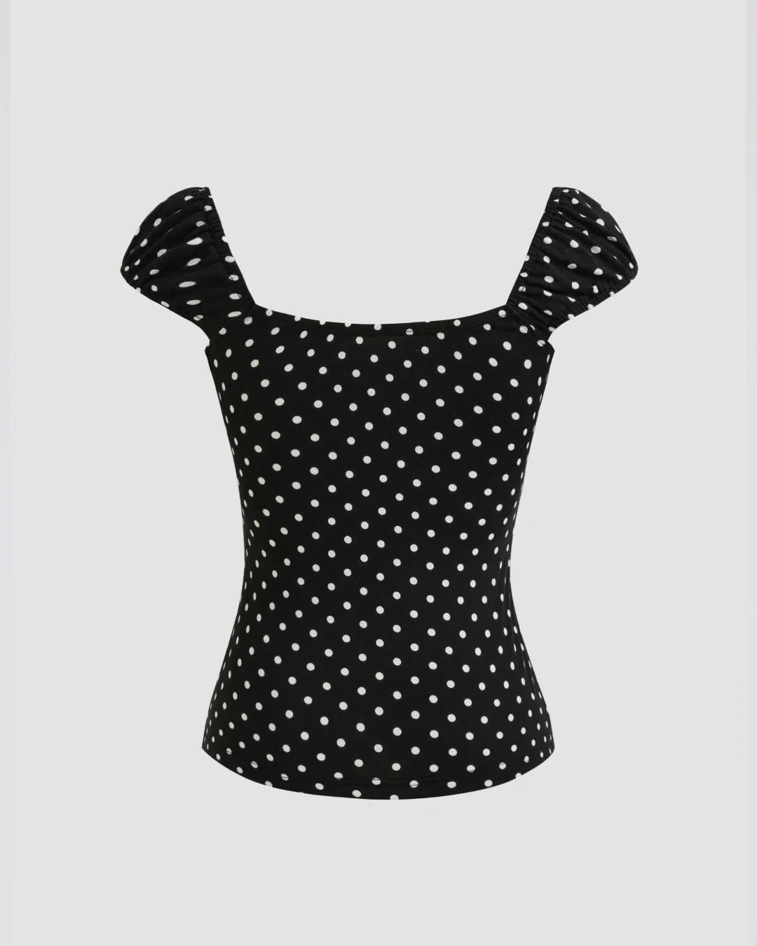 Square Neck Polka Dot Knotted Short Sleeve Top is a cute everyday essential with a soft feminine touch. Designed with a flattering square neckline and delicate front tie detail, this top brings a balanced mix of playful and chic. The subtle polka dot pattern keeps it classic while the fitted shape highlights your silhouette beautifully.