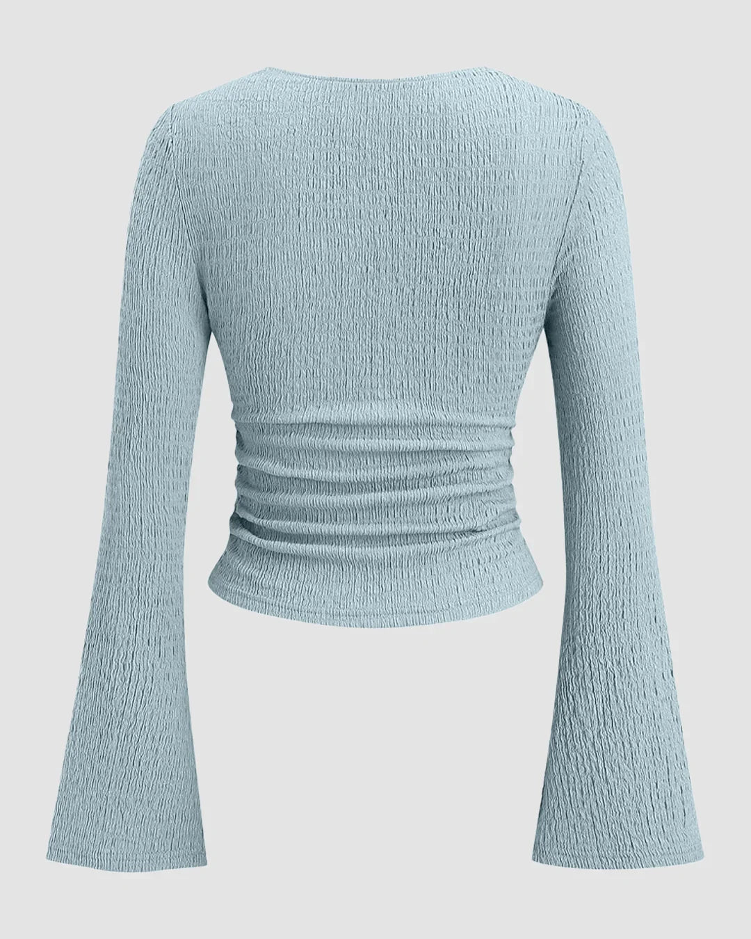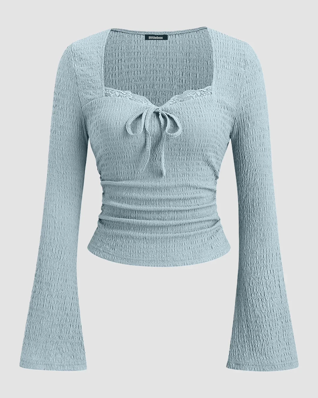 Sweetheart Neck Textured Lace Trim Flared Sleeve Fitted Tie-Bow Top in Sky Blue