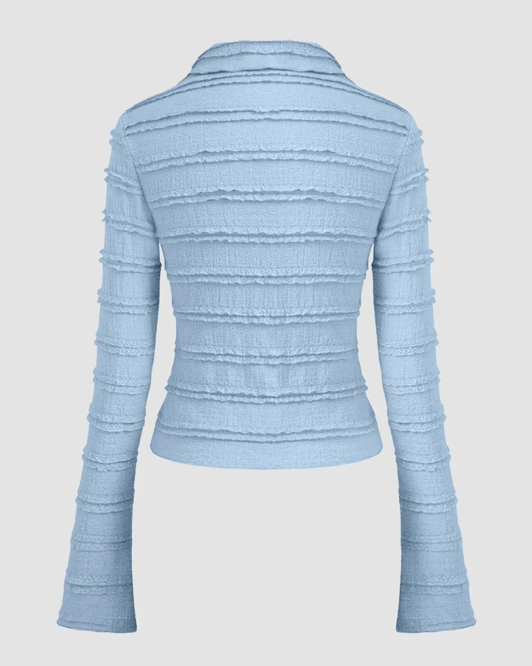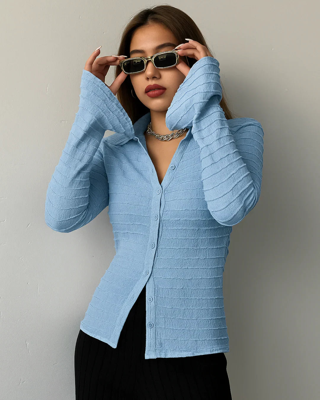 This long sleeve top blends texture with classic style, giving your outfit a chic update. Designed with button-up detailing and a collared neckline, it’s sleek yet easy to style. The dusty blue shade keeps it versatile, making this one of those long sleeve tops you’ll keep reaching for day after day.