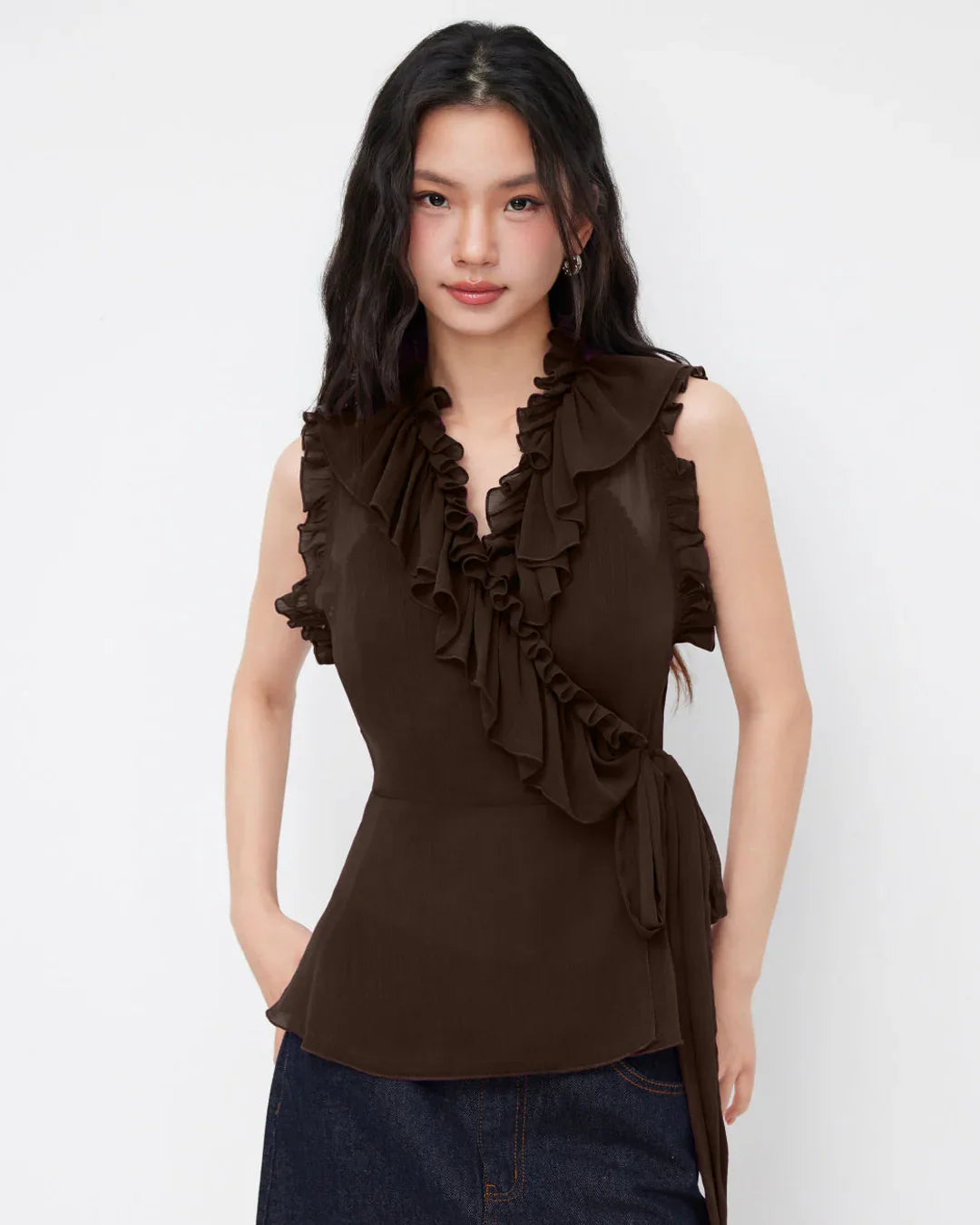 This v neck tank top brings soft drama with layered ruffle detailing and a flattering wrap-style silhouette. The deep V neckline enhances the upper frame, while the sheer textured fabric adds dimension and movement. Designed with a tie detail at the side, it shapes the waist beautifully and creates a balanced fit. This v neck tank top feels feminine, elevated, and perfect for standout styling.