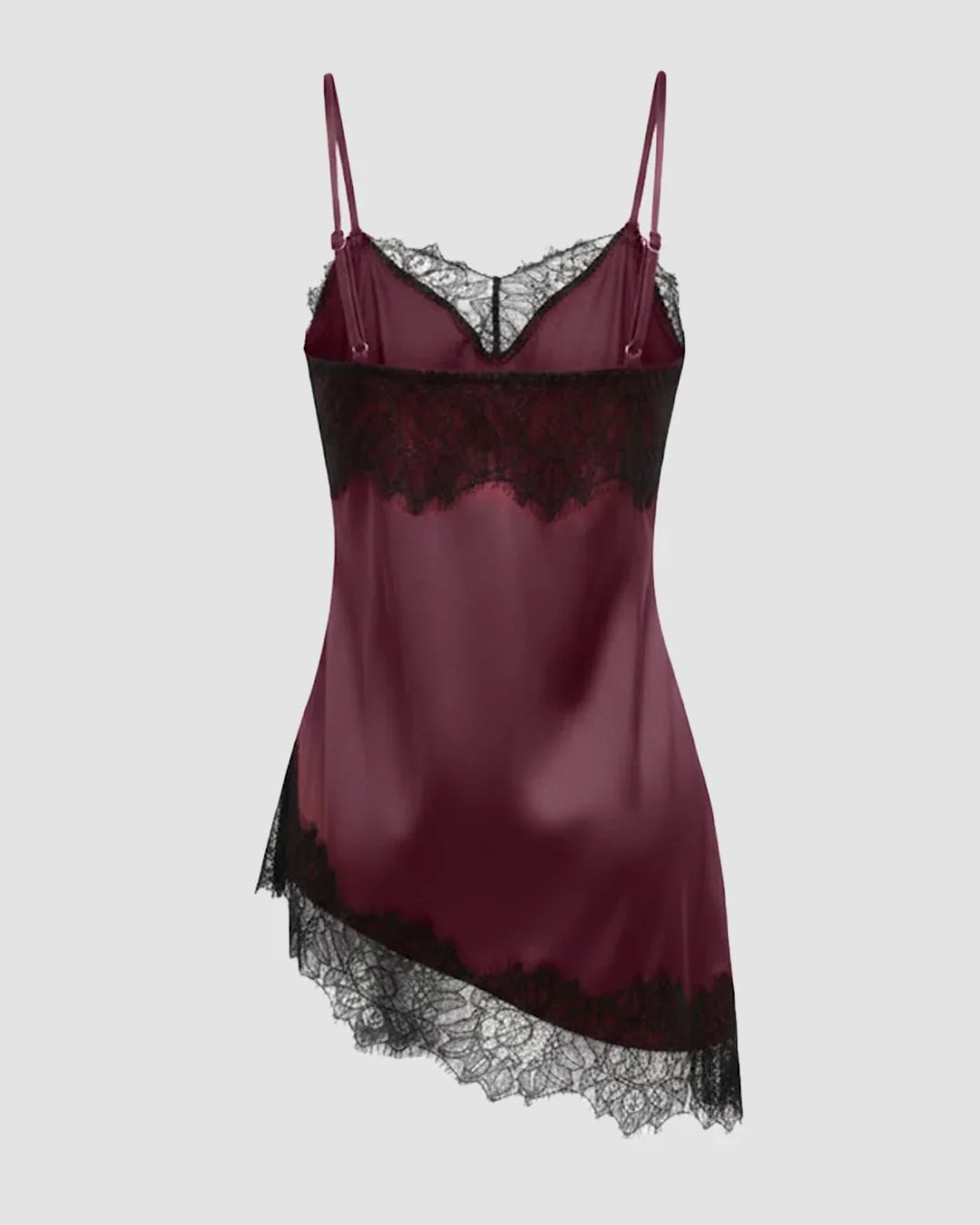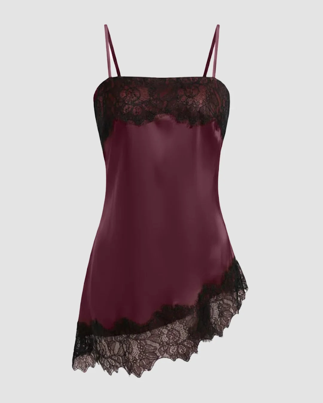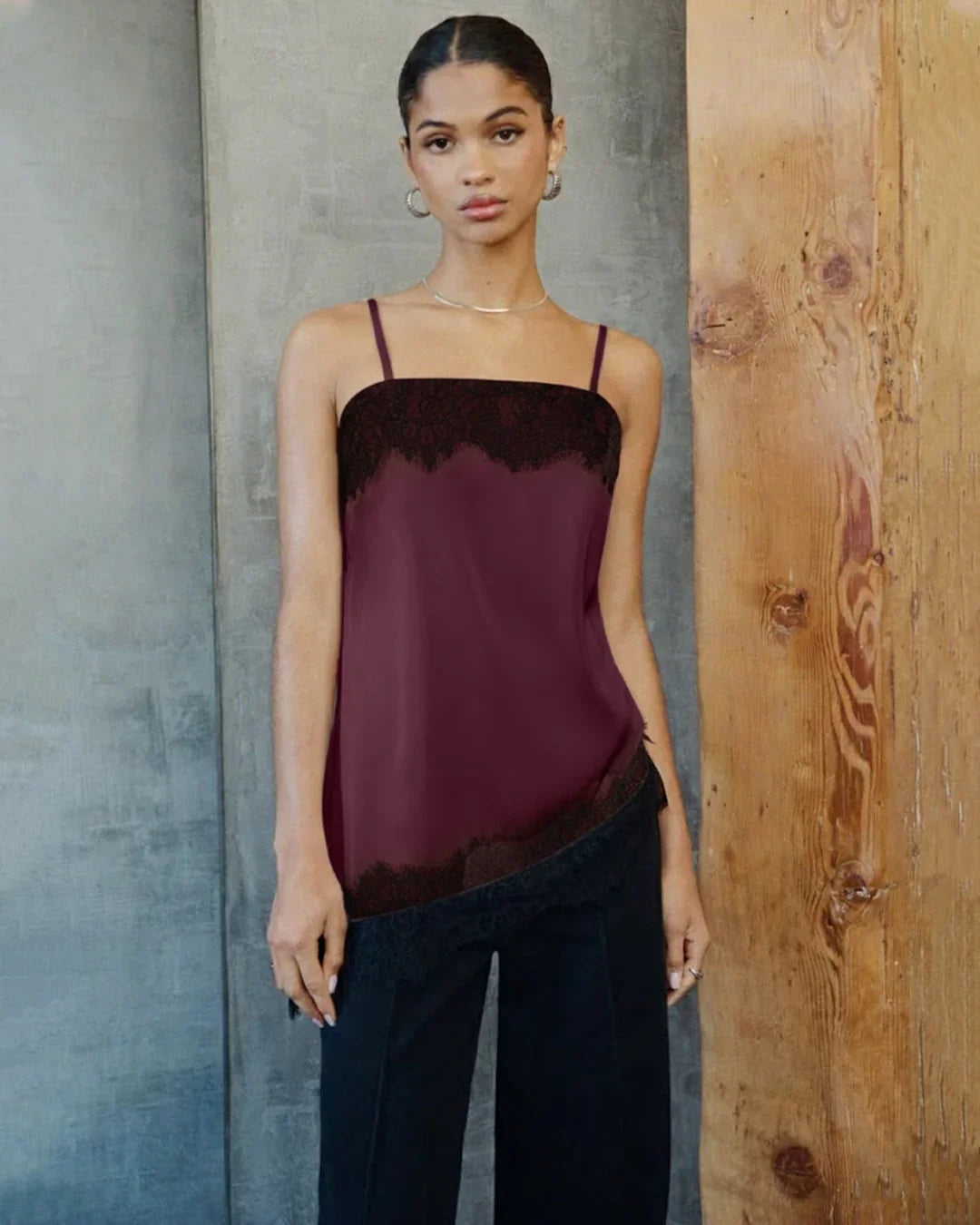 Two Tone Square Neck Lace Panel Asymmetrical Cami Top in Maroon