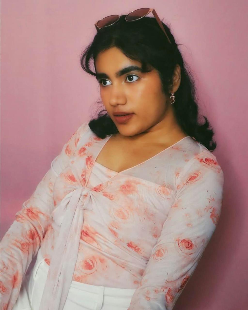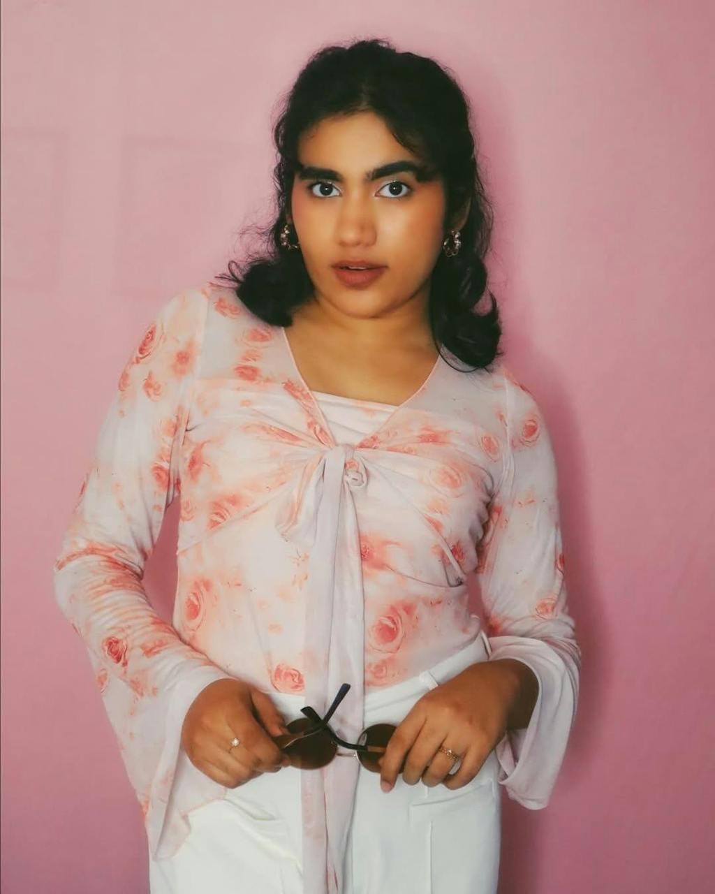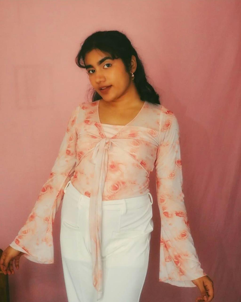 This pink full sleeve crop top brings a soft, romantic vibe with its delicate floral print and flowy details. Designed with a sweetheart neckline and front tie-up style, it creates a flattering shape that feels light and feminine. The sheer full sleeves with ruffled edges add movement, while the cropped length keeps the look fresh and modern. This pink full sleeve crop top feels cute, stylish, and perfect for everyday dressing.