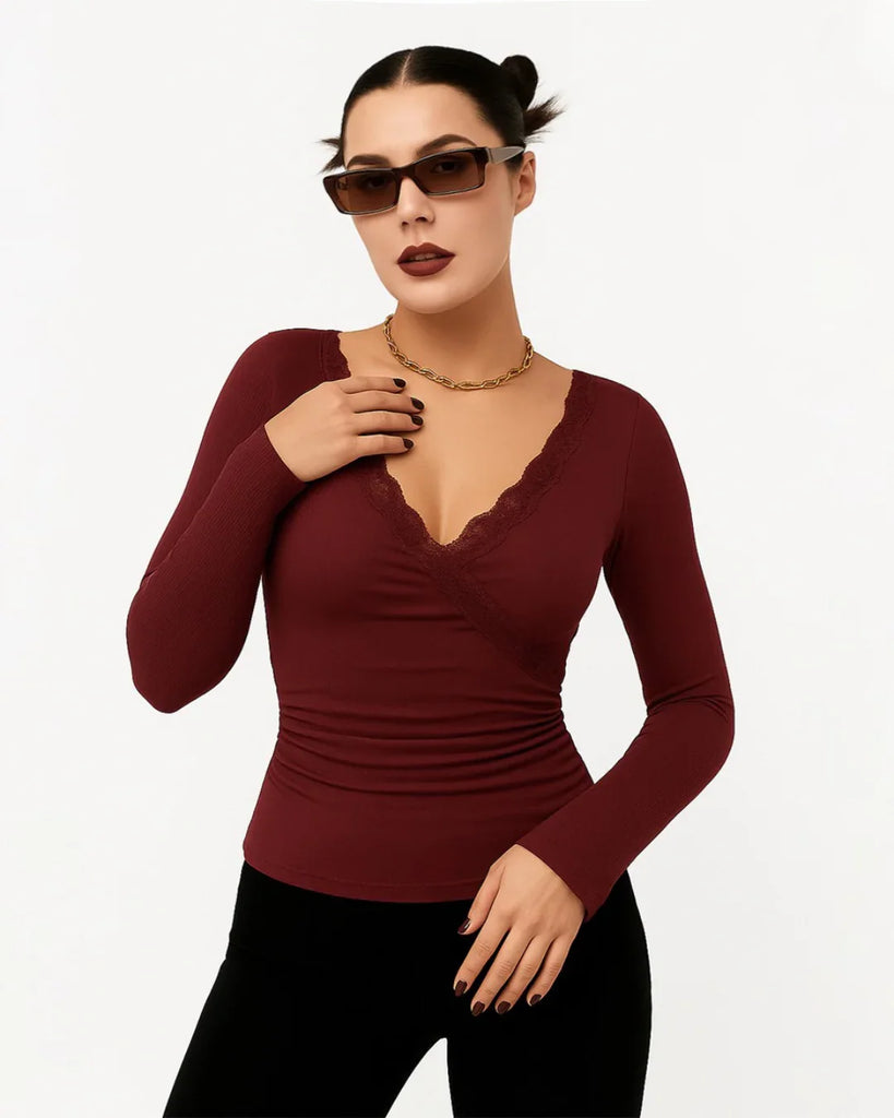 Introducing our V-neck Solid Lace Trim Ruched Long Sleeve Top In Maroon. This ruched long sleeve top brings together soft lace detail and flattering structure in one chic piece. Designed with a scalloped lace-trimmed V neckline, subtle ruching at the waist, and a slim silhouette, it’s all about feeling feminine and styled up without trying too hard.