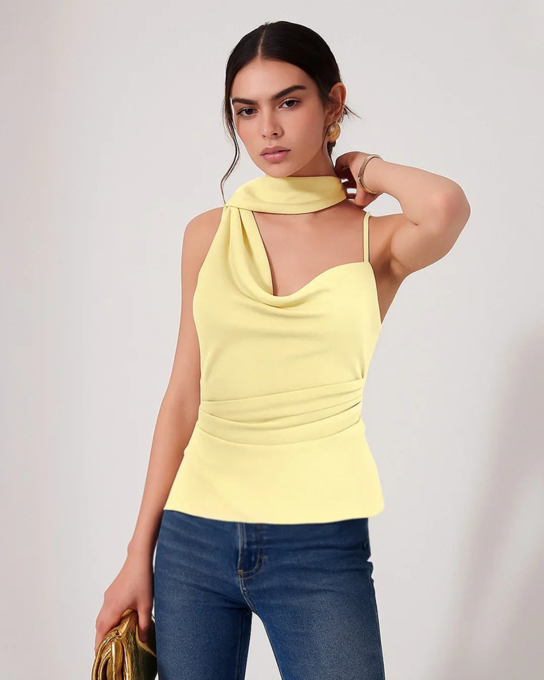 Perfect for dressing up denim or going bold with co-ord pants, this draped scarf top takes your look from basic to breathtaking in seconds.