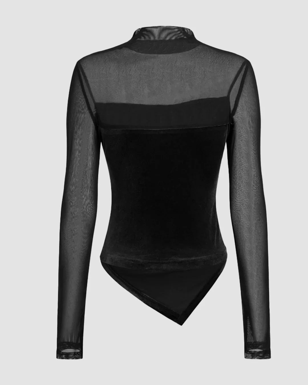 Velvet High Neck Patched Asymmetrical Ruched Top in Black brings together sleek structure and soft texture in the most effortless way. Designed with a fitted velvet body and sheer mesh sleeves, this top stands out with its asymmetrical hem and subtle ruching that shapes the waist naturally. The high neckline keeps it polished, while the contrast fabric adds depth without feeling heavy. Stretchy and lightweight, it sits close to the body while staying comfortable for long wear. If you like statement tops that still feel wearable, this Asymmetrical Ruched Top in Black is an easy pick.