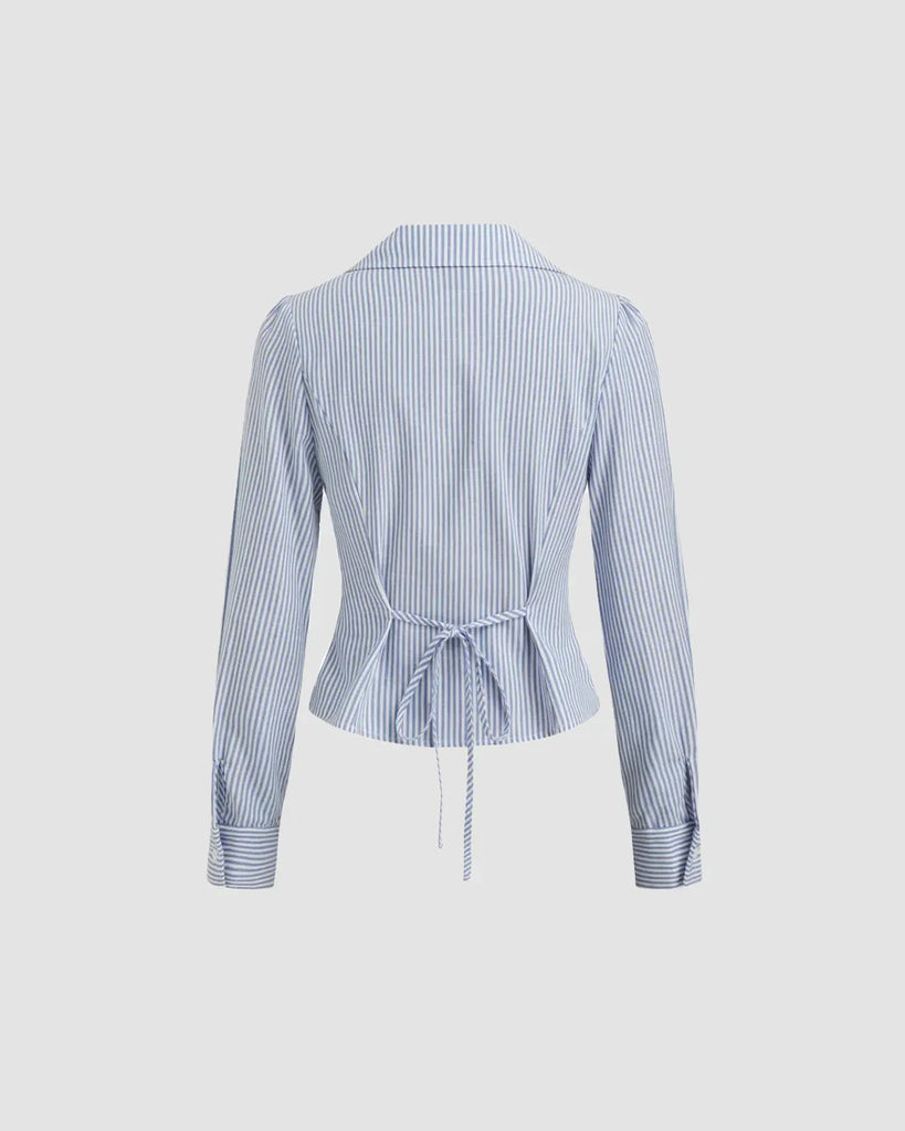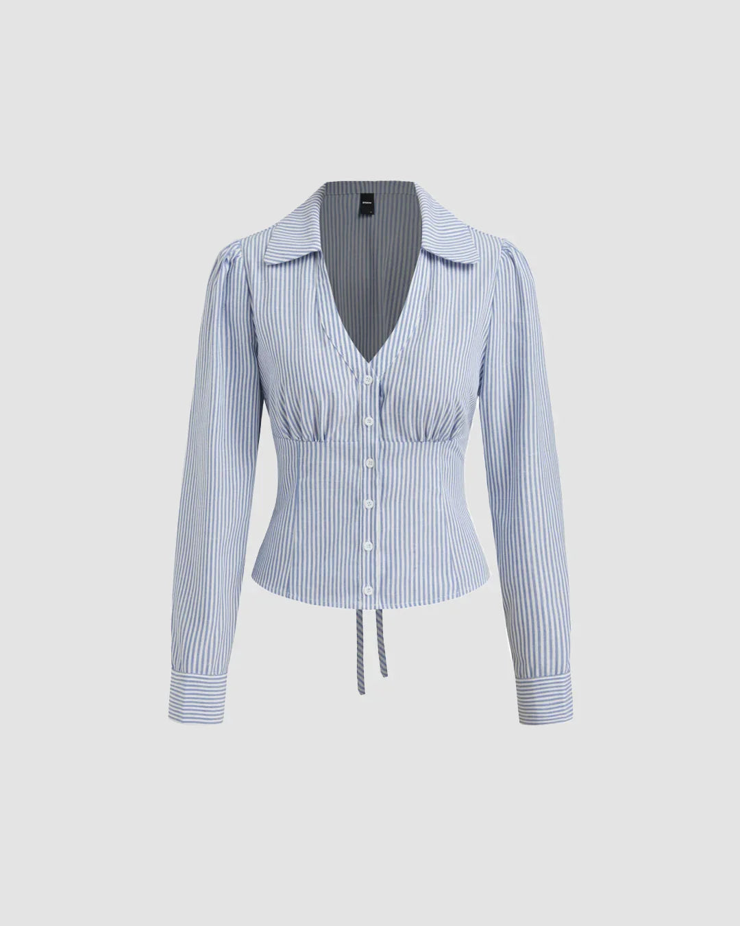 Add timeless elegance to your collection with this striped design that stands out among long sleeve tops. Featuring a deep V-neckline, button-down front, and subtle waist detailing, it gives a flattering fitted silhouette with a touch of vintage charm. Perfect for casual wear or smart outings, this shirt blends comfort with sophistication, making it one of the most versatile long sleeve tops.