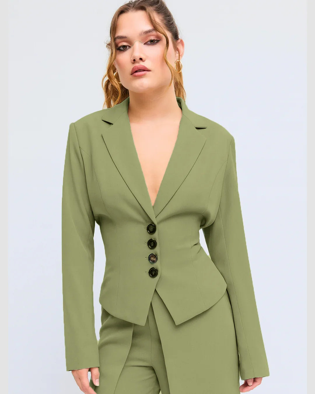 The Woven Collar Solid Lace Up Button Blazer In Herbal is all about tailoring with a chic edge. Designed with a sharp blazer collar, structured fit, and lace-up detail at the back, it’s where sophistication meets statement. The twill-blend fabric offers comfort and durability while keeping the fit sleek. Perfect for desk to dinner, this blazer collar design adds effortless polish to every look.