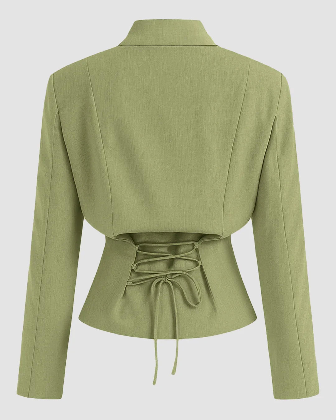 Woven Collar Solid Lace Up Button Blazer In Herbal