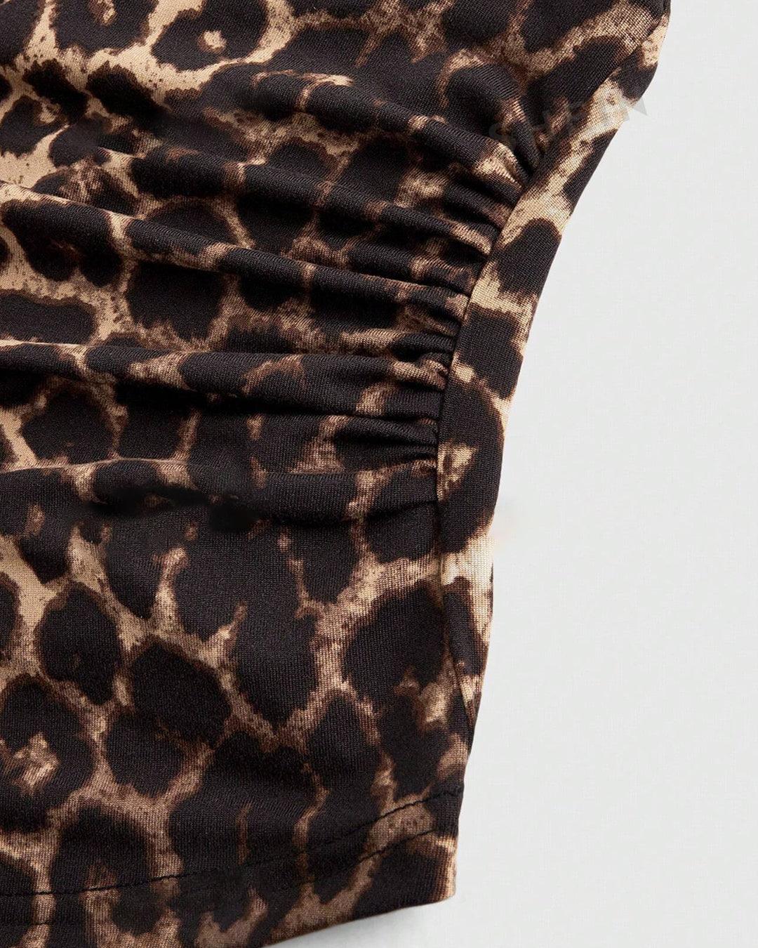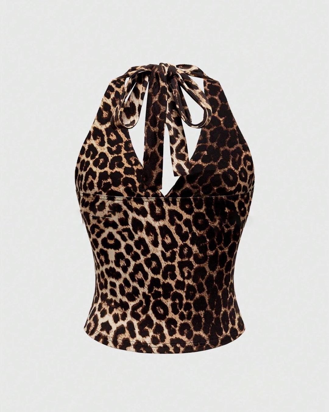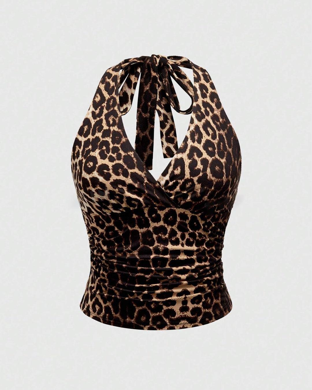 Halter Neck Leopard Print Ruched Stretch Sleeveless Top