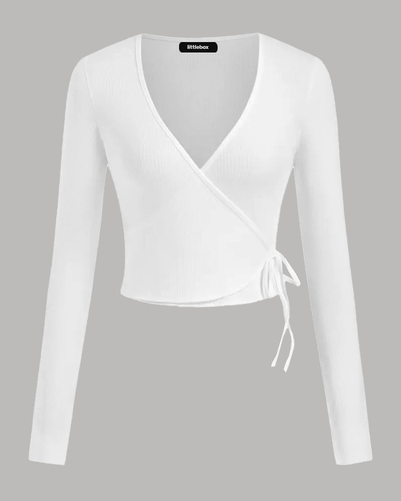 White polka dot puff sleeve wrap top with a bow and ruffle detailing, perfect for a stylish casual look.