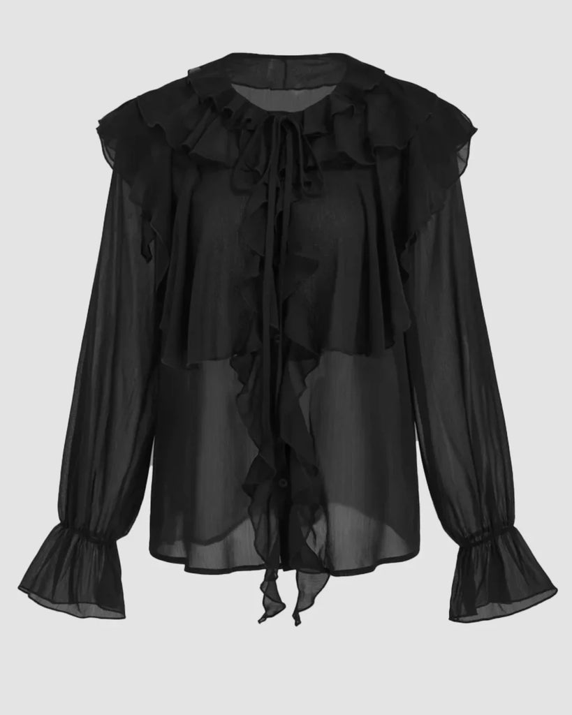 Black top with bell sleeves featuring a ruched button front and flounce design.