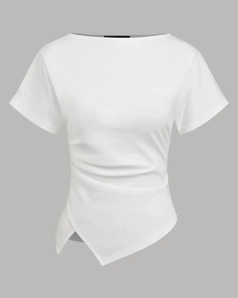 A white one-shoulder top with tie detail, featuring a clean design that keeps the overall look simple and elegant.