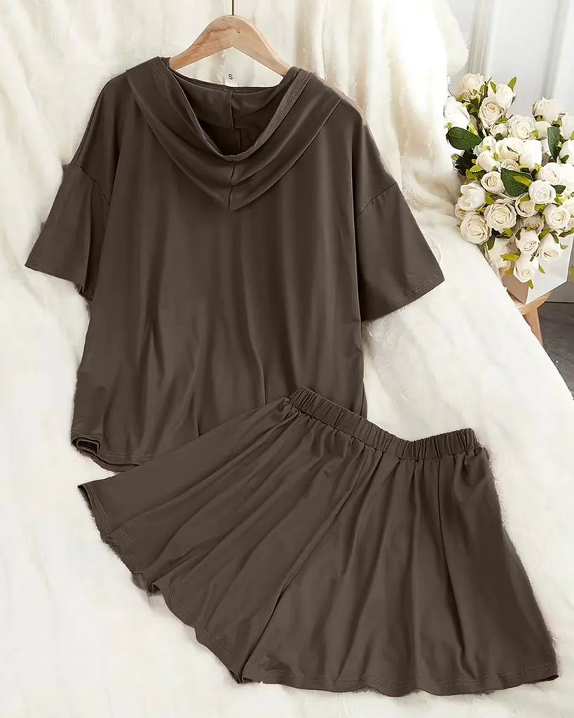Casual Hoodie Sweatshirt and Drawstring Shorts Co-Ord Set in Brown