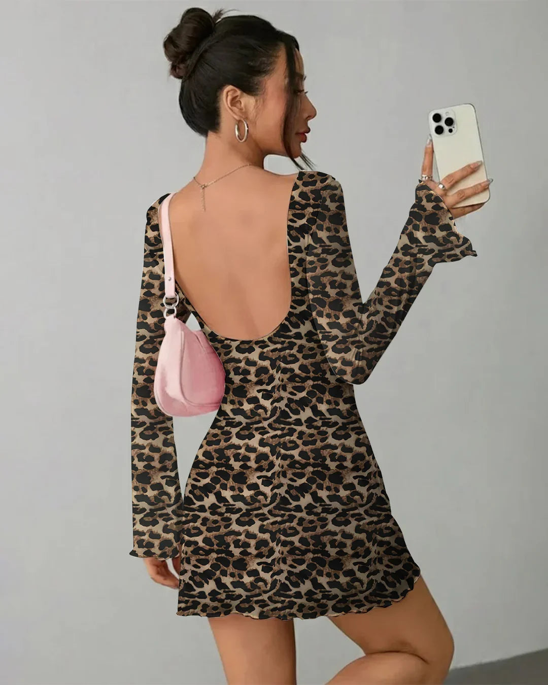 Leopard Print Boat Neck Full Sleeve Mini Dress