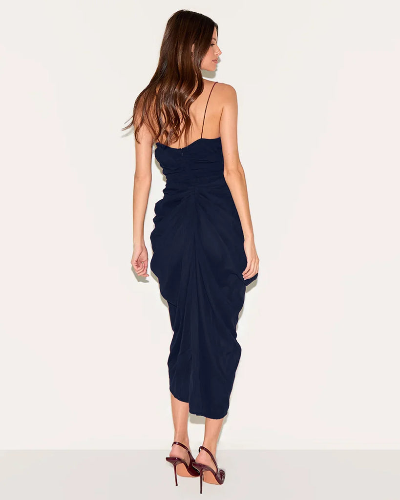 Navy Blue Ruched Spaghetti Strap Slit Midi Dress