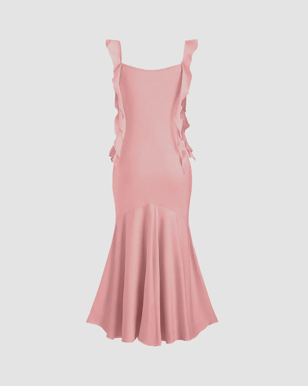 Bring on the soft drama with our Pink Ruffle Strap Fishtail Midi Dress. Featuring ruffled straps, a gentle cowl neckline, and a sculpted body that flares into a fishtail hem, this fishtail midi dress is made to move with elegance and turn heads without trying.