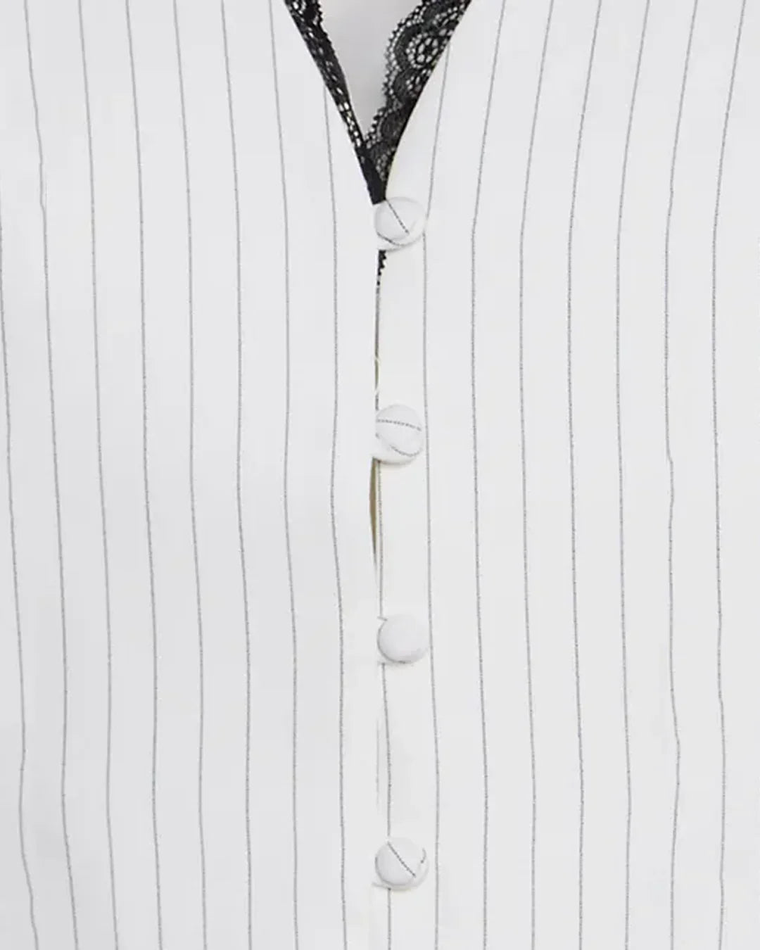 This pinstripe waistcoat is a perfect mix of sleek tailoring and subtle edge. Designed with a deep V-neckline trimmed with delicate lace, it adds a touch of femininity to the classic structured fit. The button-down style and vertical pinstripes create a clean, elongated look that works for both formal and casual layering.