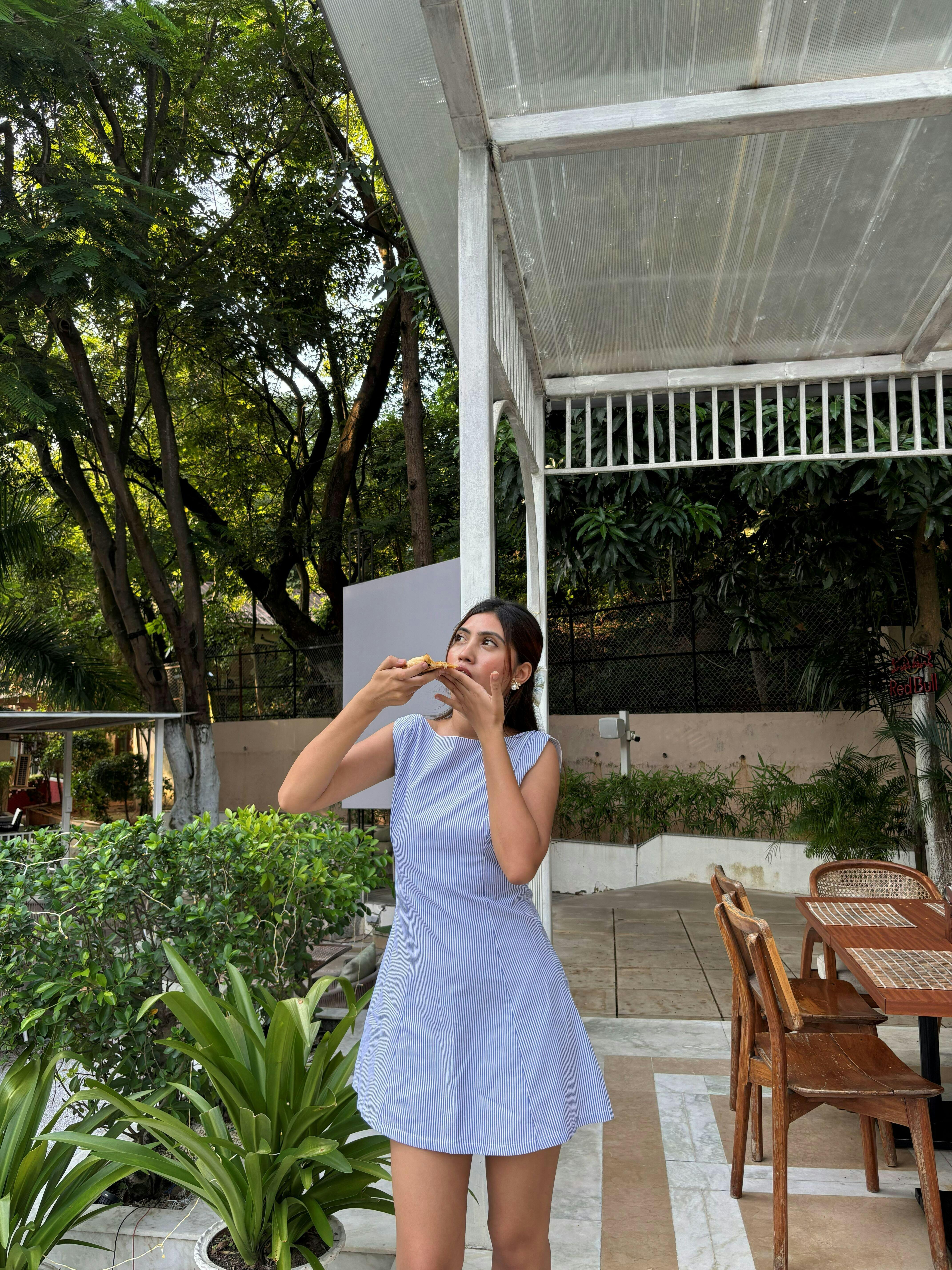 Our Sleeveless Blue Striped Bodycon Mini Dress for Women is made to keep things cute and comfy. With its deep scoop back and big bow at the waist, this bodycon mini dress gives you a stylish shape while still feeling light and relaxed.