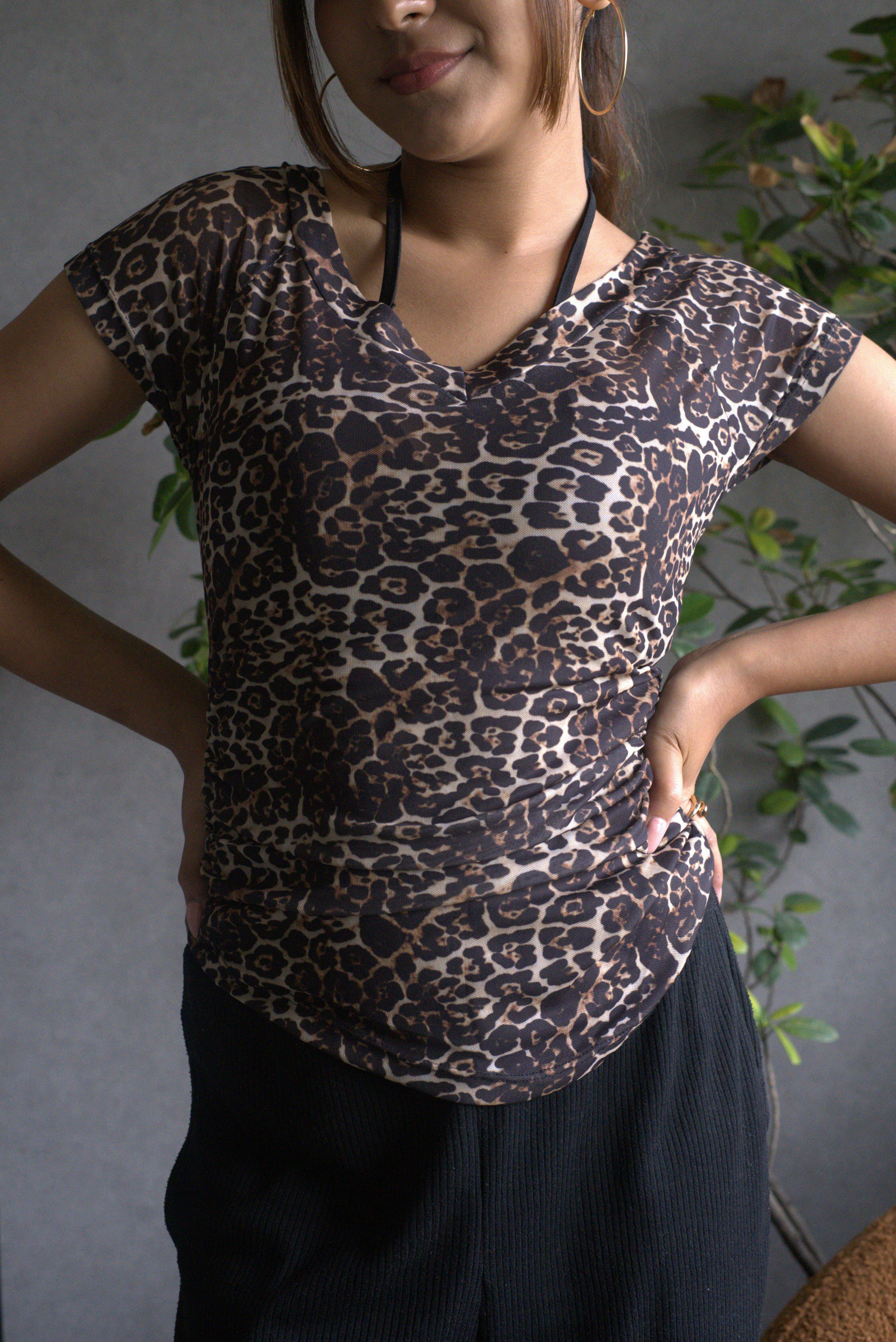 Introducing our V-neck Leopard Halter Short Sleeve Tee.