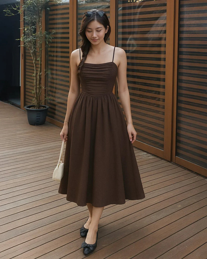 This chocolate brown dress brings a classic feel with a flirty twist. Designed with a ruched bust and slim spaghetti straps, it highlights your neckline and waist while flowing into a breezy, vintage-inspired midi hem. The soft texture and flowy silhouette make it perfect for dressing up or keeping casual.