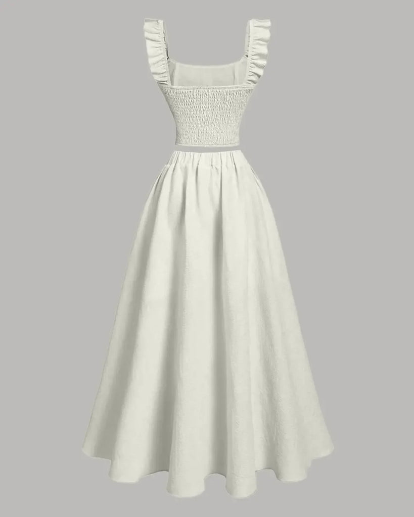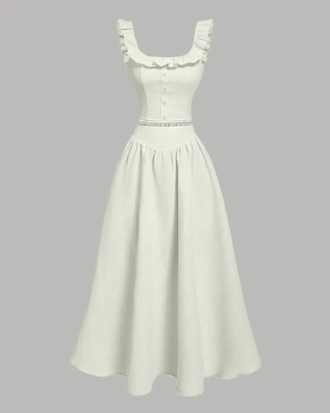 The Vintage Style Sleeveless Top And Skirt Set in Beige brings a soft, timeless look with a modern twist. The fitted top has a button front and gentle ruffle details that add a cute touch, while the flowy skirt gives easy movement and a relaxed shape. This Top And Skirt Set in Beige is perfect for days when you want something fresh, light, and feminine.