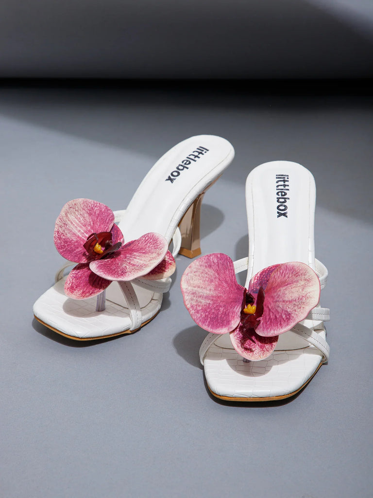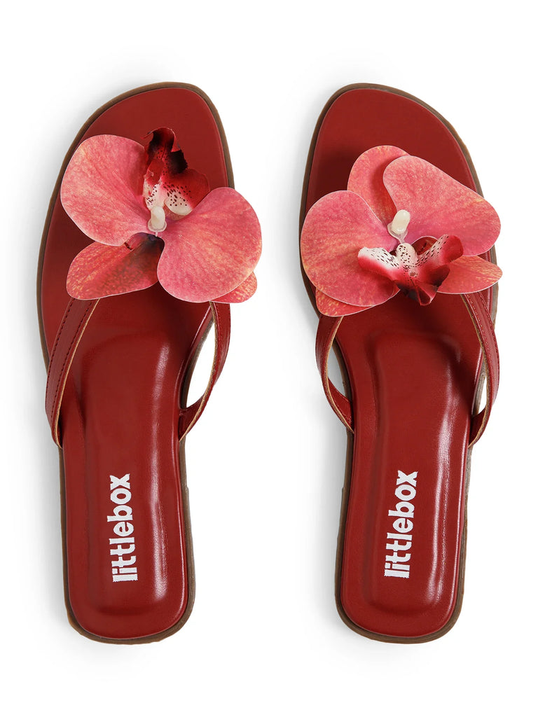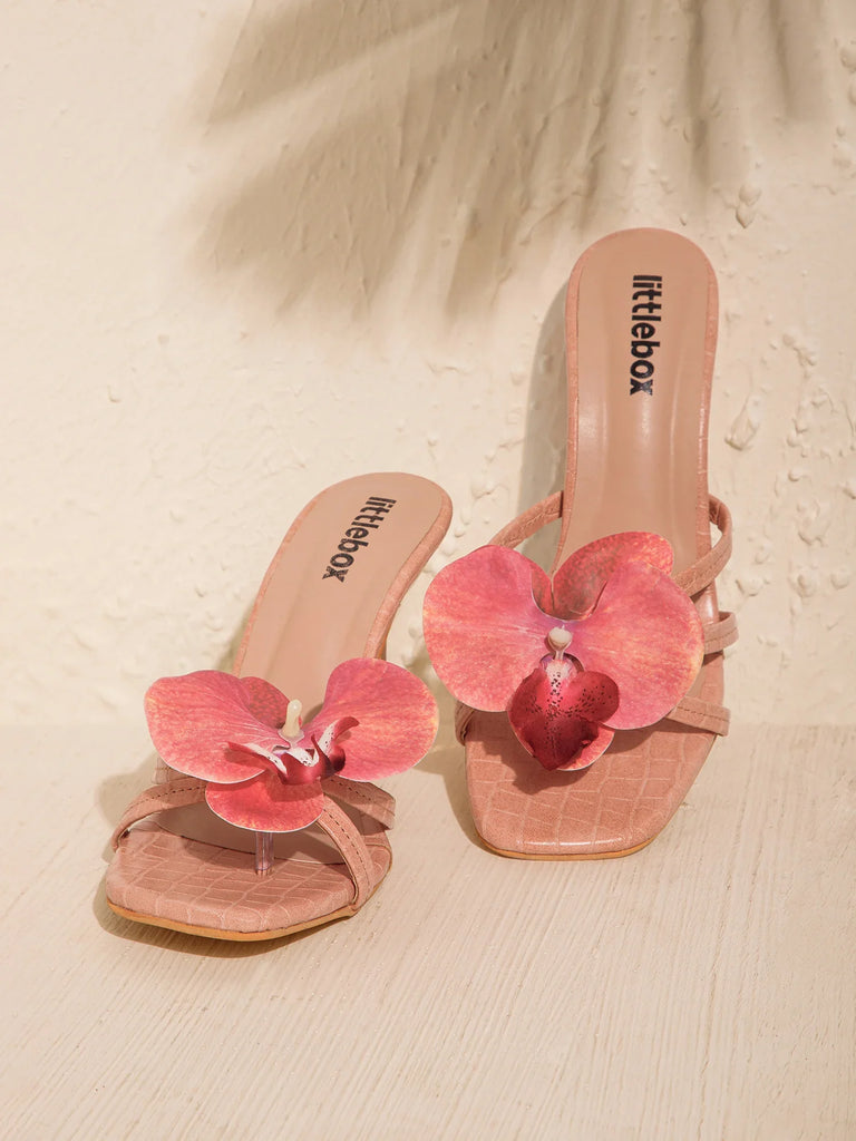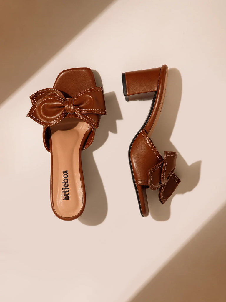 A pair of burgundy high-heeled sandals featuring a bow on the heel and a square toe design