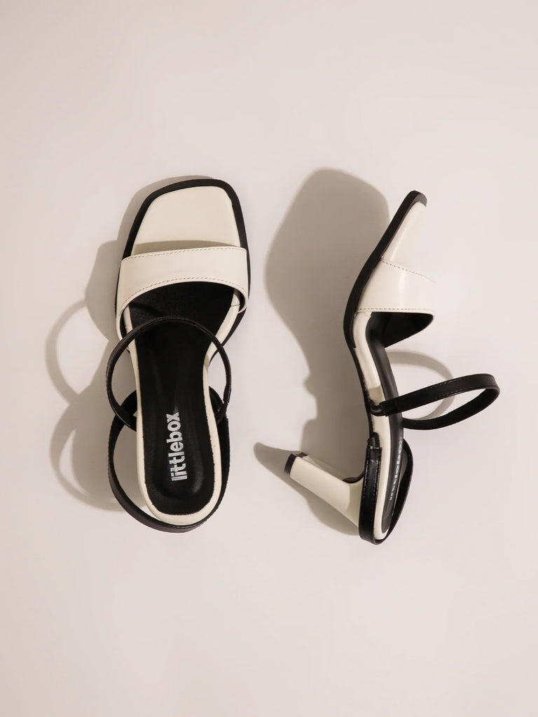 A woman's legs wearing black, white and pink leather sandals with laces, showcasing summer's trending black, white, pink lace-up platform heels