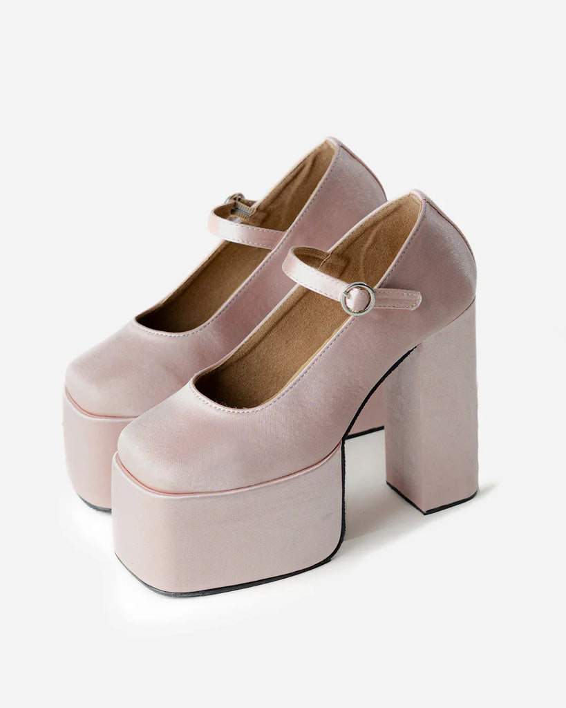 A woman wearing burgundy chunky heeled platform shoes, paired with black stockings, stands confidently