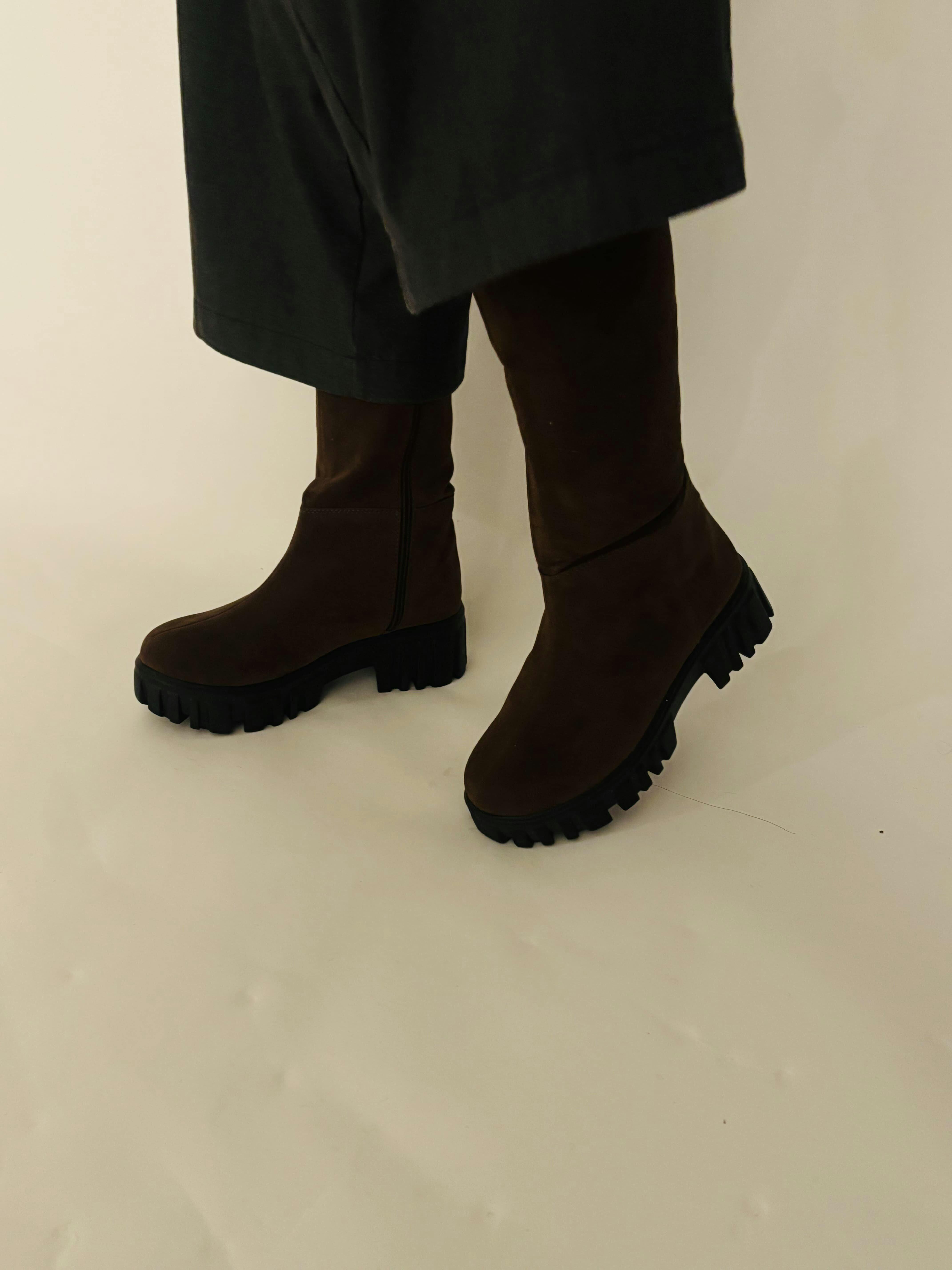 Brown Chunky Sole Knee High Long Biker Boot