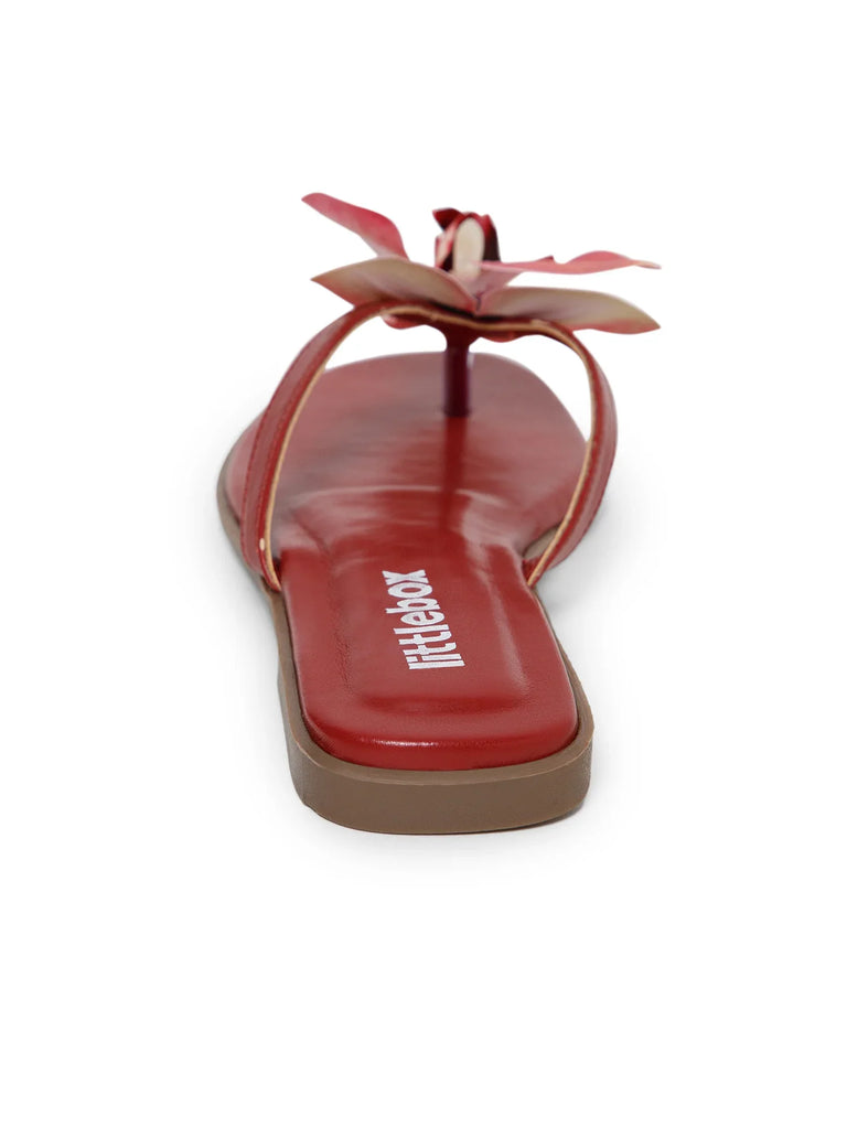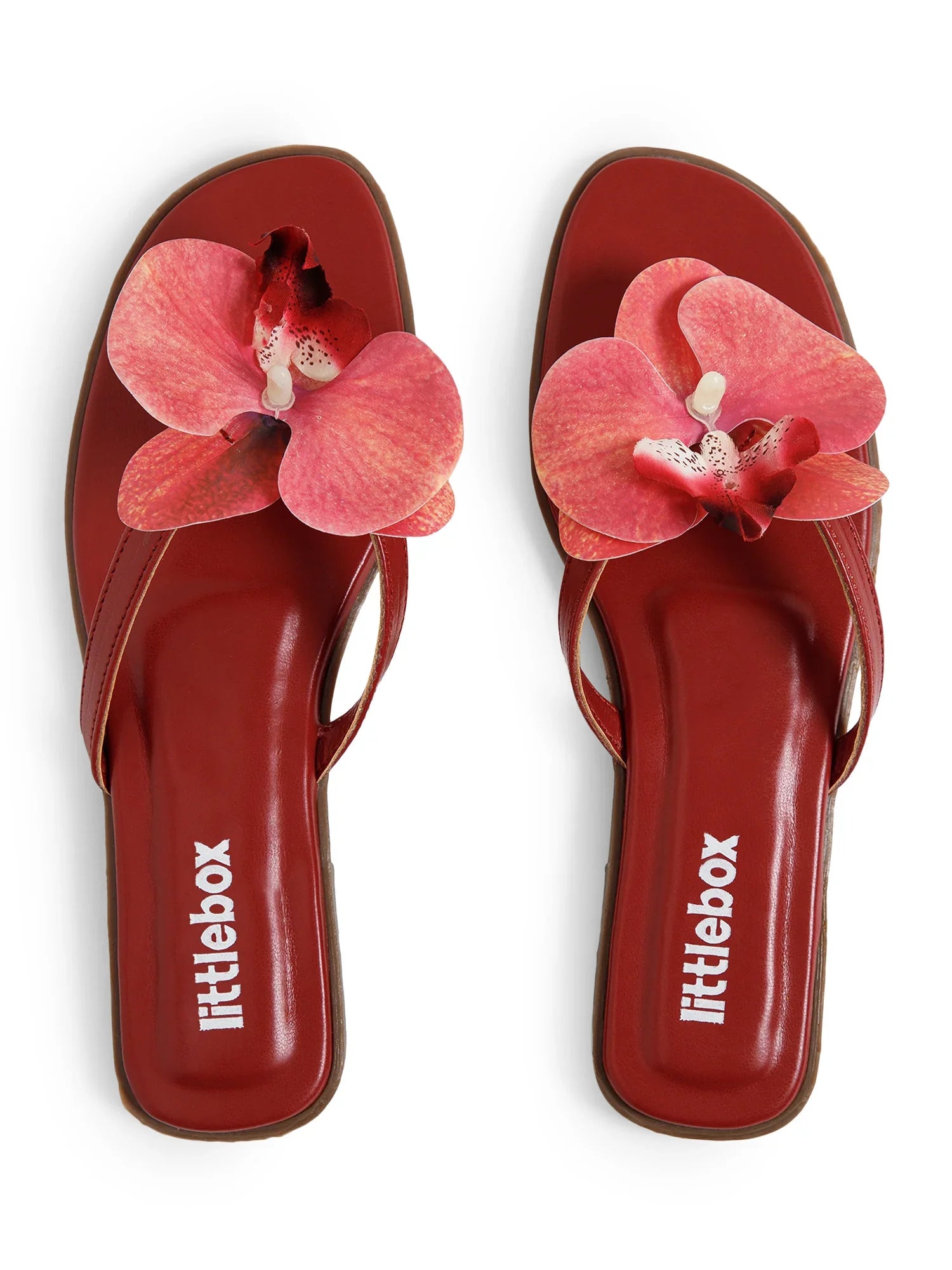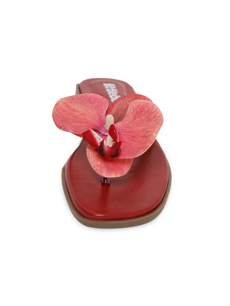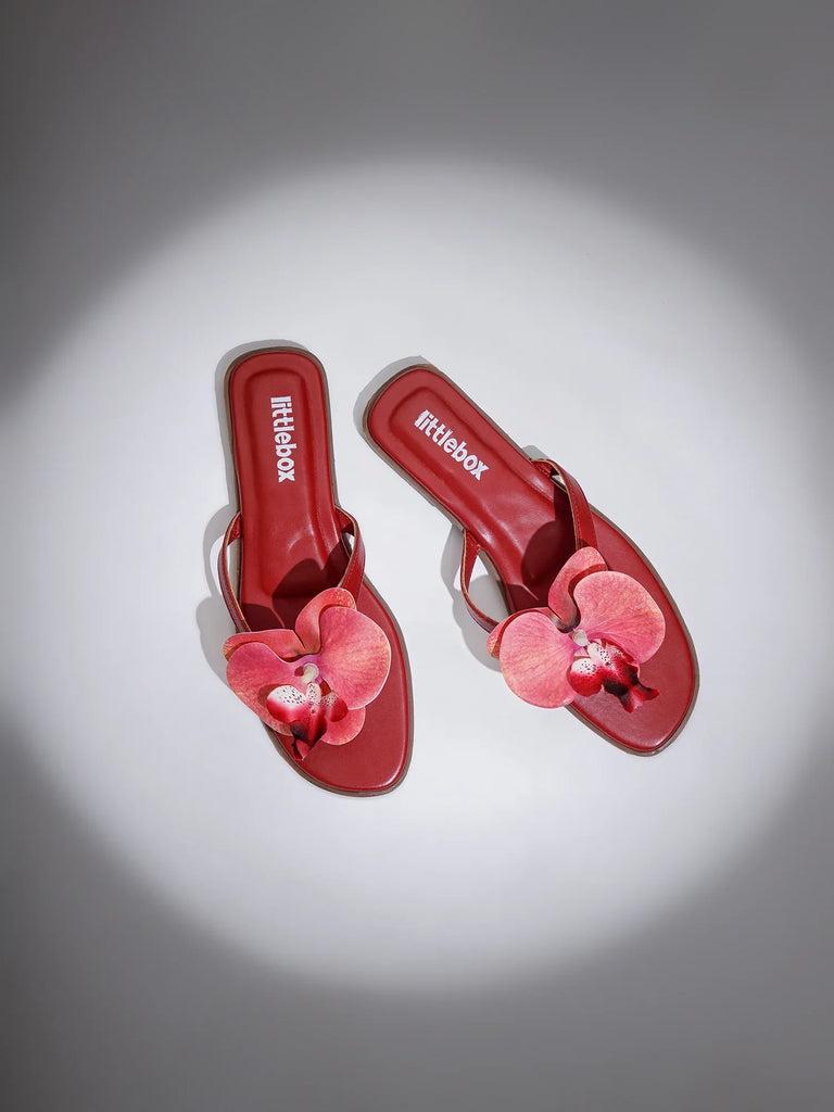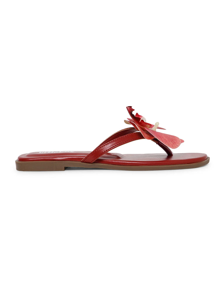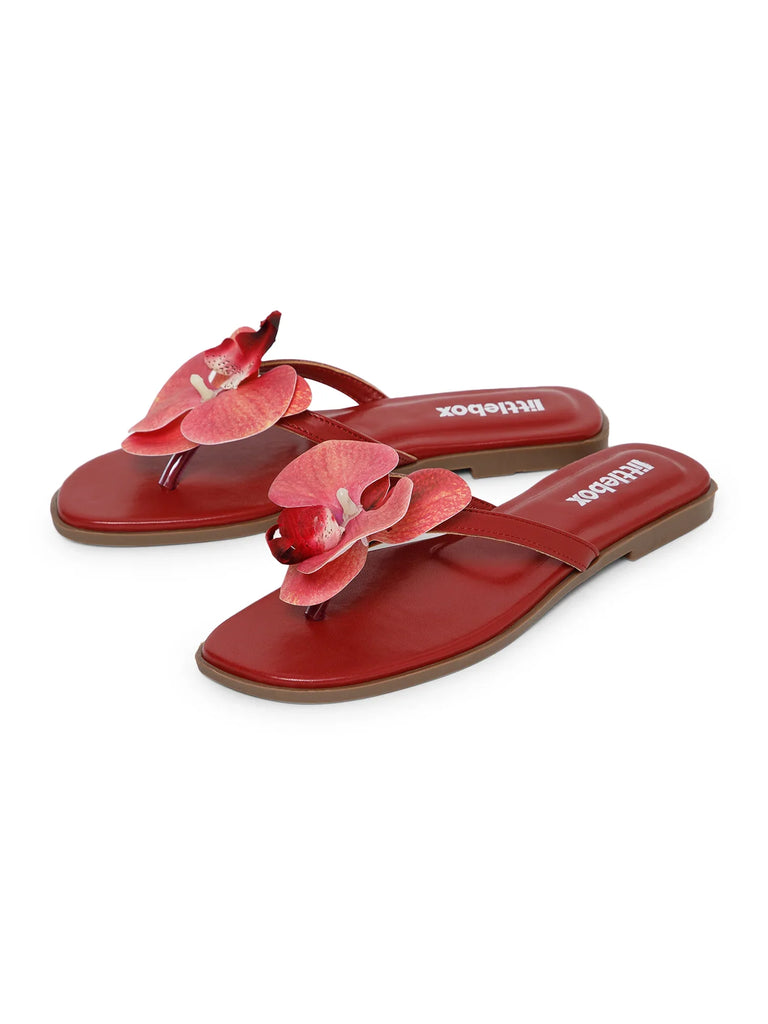 Cherry Butterfly Orchid Decor Beach Flat brings a bright cherry tone with a soft tropical vibe. The bold orchid detail adds a sweet standout touch while still keeping the look clean and minimal. These womens flats feel light, soft, and easy to slip into, with a cushioned base that makes them perfect for warm days and everyday plans. The open toe style keeps everything airy, giving you a mix of comfort and cute vacation energy.