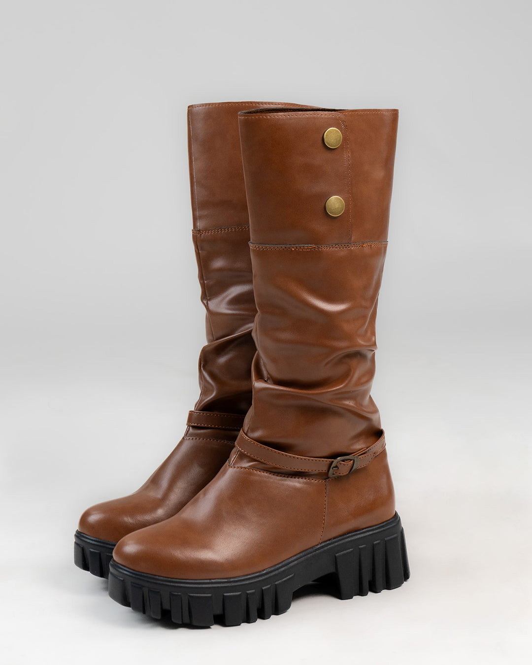 Chunky Fit Round Toe Buckle Knee High Boots in Brown
