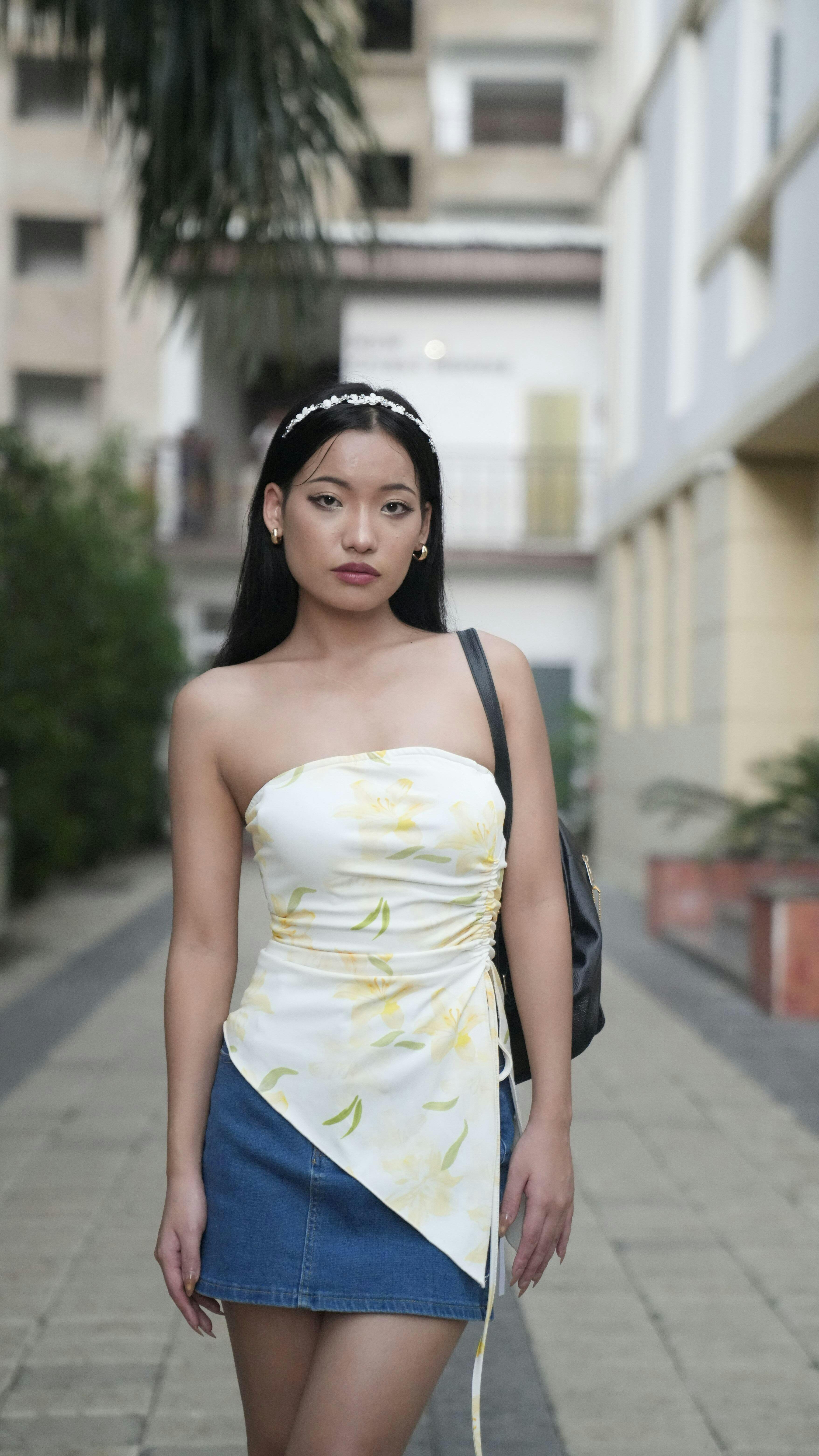 Introducing our Asymmetrical Floral Print Ruched Strapless Top. This ruched strapless top is the definition of flirty meets elevated. The asymmetric hem and side drawstring add playful edge, while the delicate yellow floral print softens the vibe. With a body-hugging fit and breezy fabric, it’s made for when you want to show up cute with zero effort.