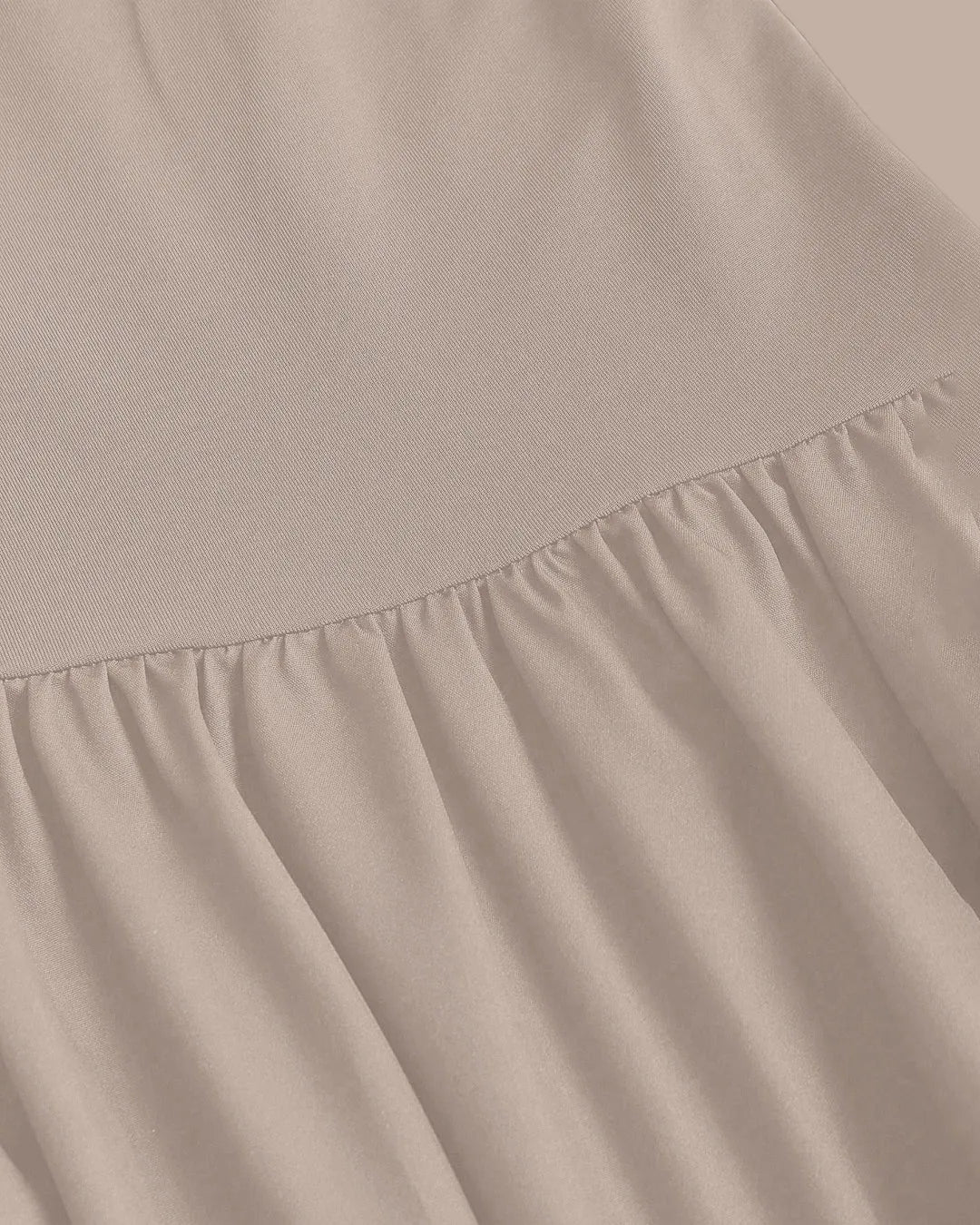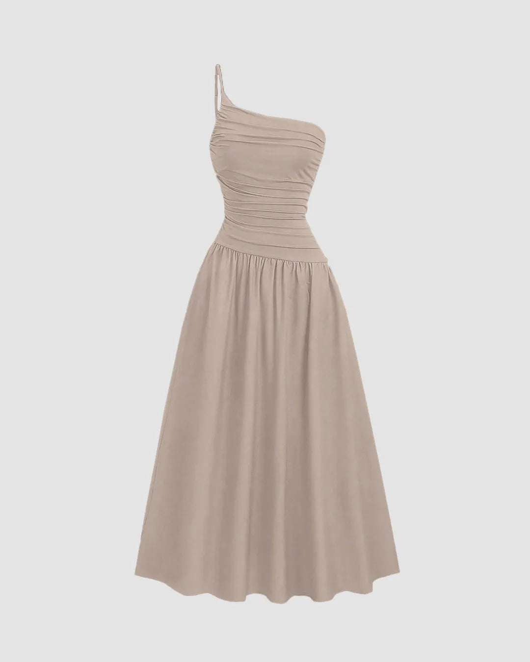 Flared Midi Dress In Beige is your soft-glam moment in motion. With its single-shoulder neckline and ruched bodice, this flared midi dress gives you just the right shape while staying comfy. The flared hem flows with every step, making it your go-to for plans that call for subtle drama.