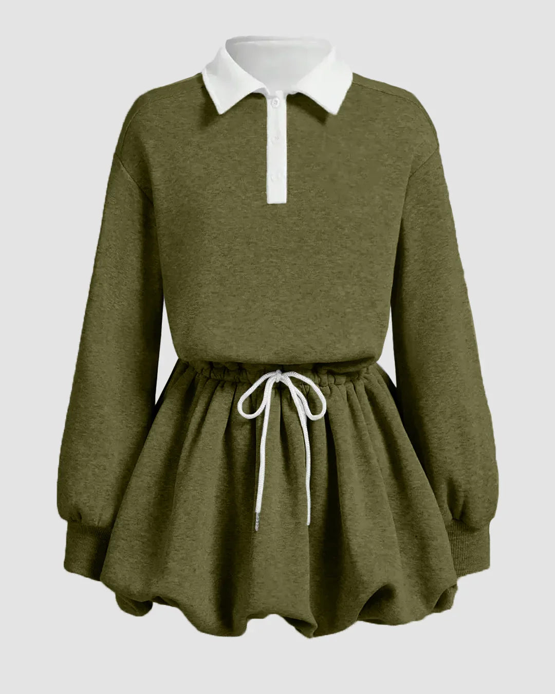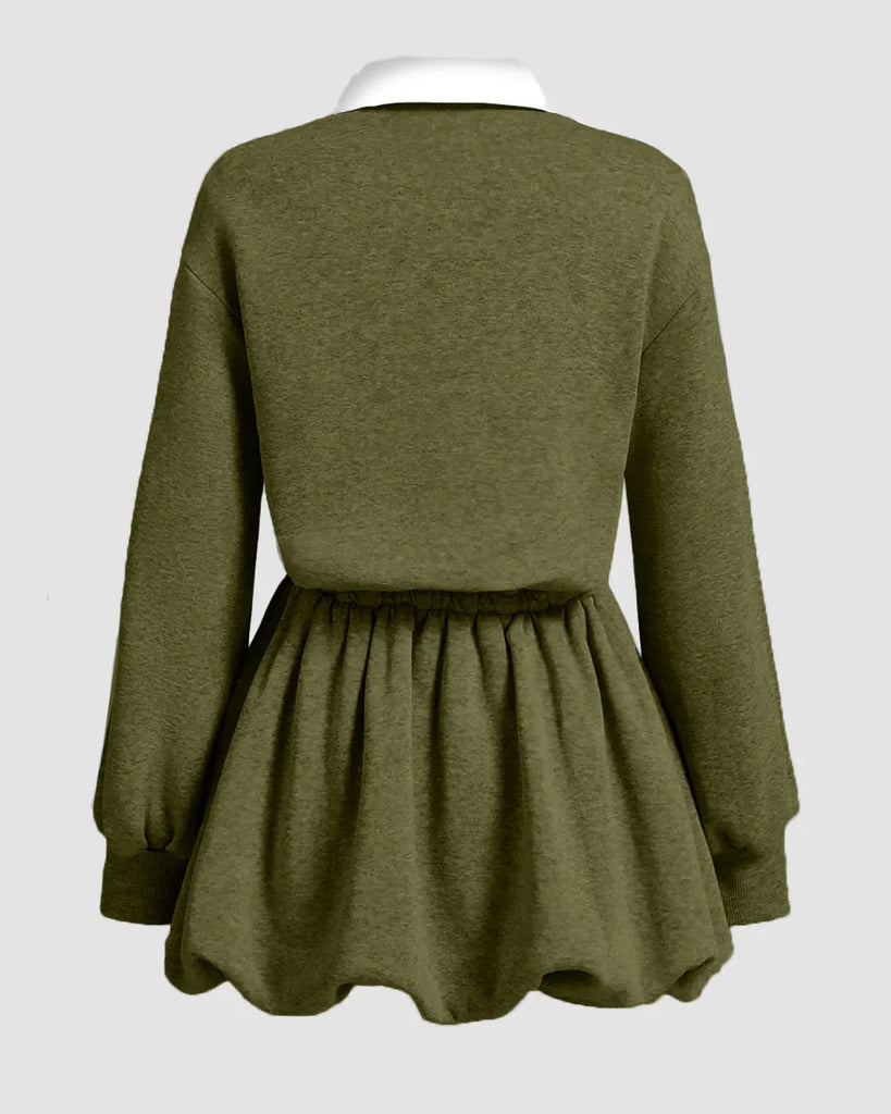 Avocado Sports Bud-Shaped Bubble Long-Sleeved Dress blends sporty ease with a standout silhouette. The polo collar and long sleeves add a crisp, preppy touch, while the bubble hem creates playful movement. A drawstring tie at the waist cinches the fit, making this avocado dress both flattering and comfy for everyday wear.