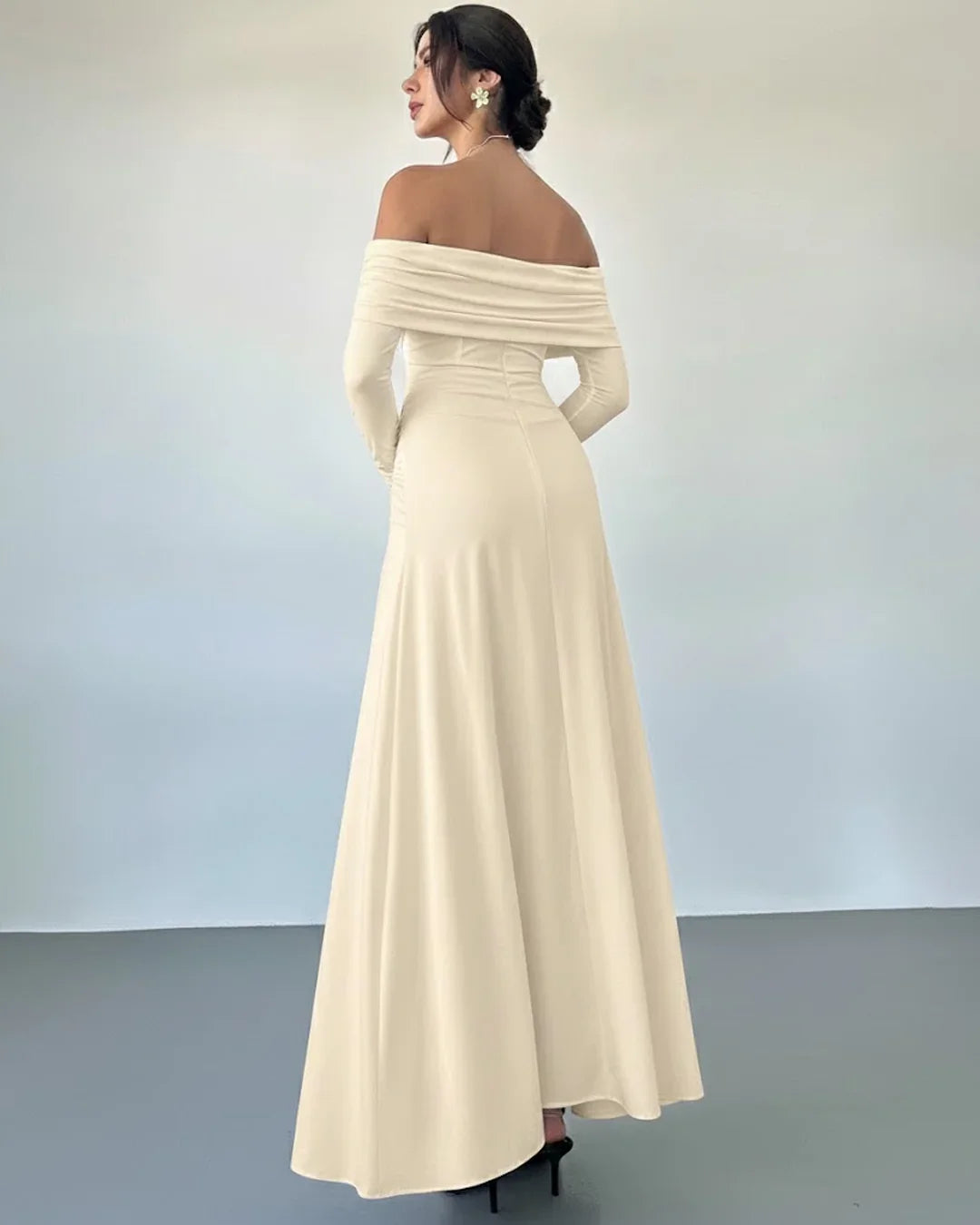 Beige Off-Shoulder Ruched Waist A-Line Twist Maxi Dress