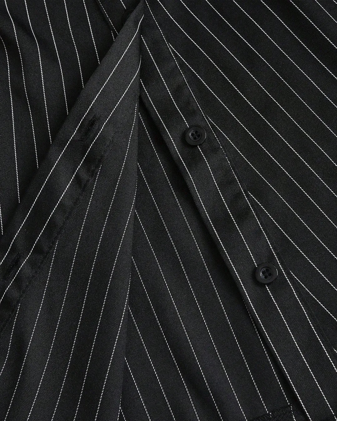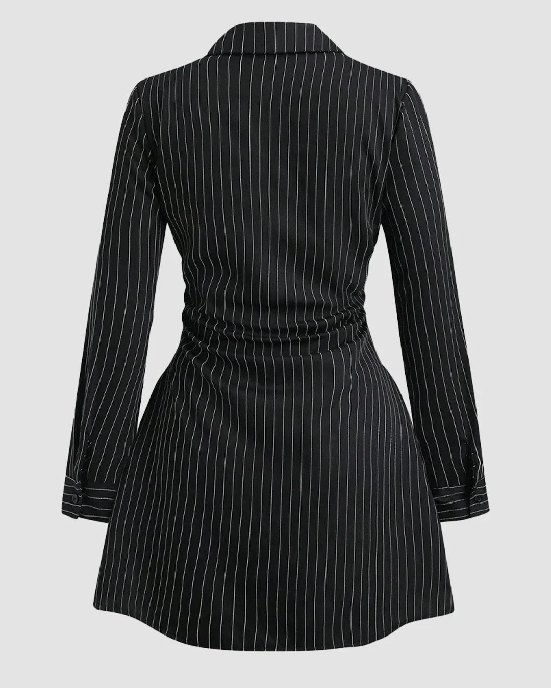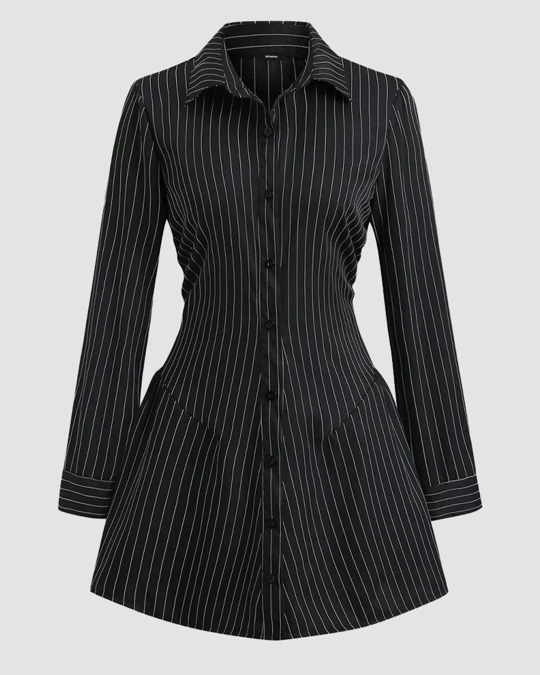 Black Pinstripe Button Down Collared Fit & Flare Full Sleeve Mini Dress